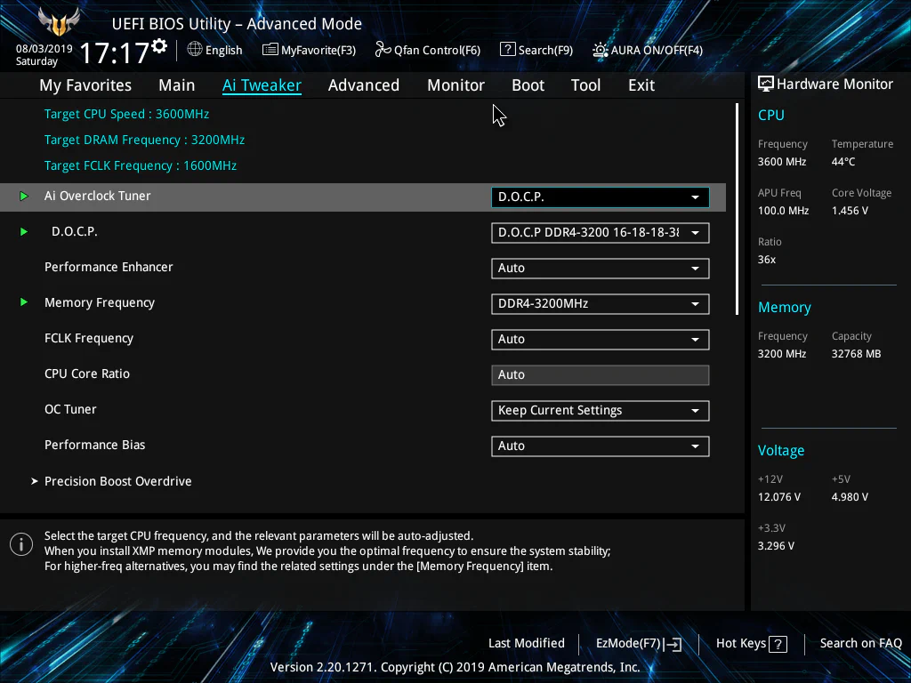 Then, set “Ai Overclock Tuner” to “D.O.C.P.” and the “D.O.C.P.” setting to “D.O.C.P. DDR4-3200 16-18-18-38”. Also verify that the “Memory Frequency” option now says “DDR4-3200MHz” as shown below. Finally, click “Exit” and save the changes to apply the proper timings.