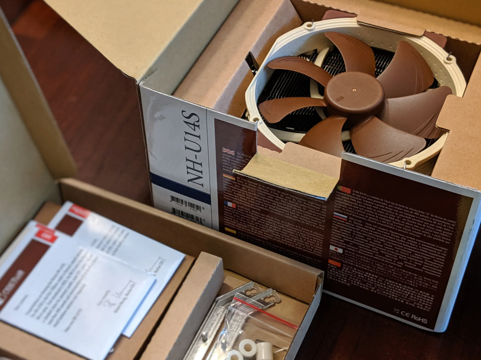 In my previous machine, I used a Cooler Master Hyper 212 EVO. I thought about reusing it, but that would have required contacting Cooler Master for new mounting brackets (ours were older than AM4 sockets). Instead, I decided to continue my trip into Whoppers-land and go with a ginormous 140mm Noctura NH-U14S (they do make a 120mm version for cases with less room as the NH-U14S needs 165mm of clearance).