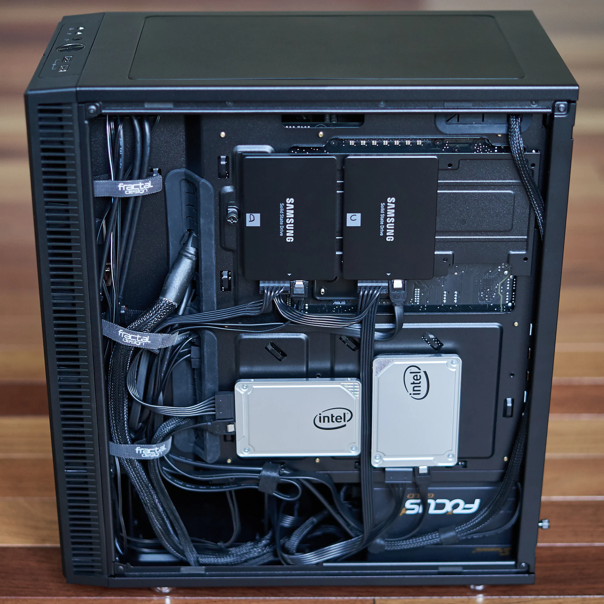 Also note that for most people, this many drives is likely overkill. I use the two Intel drives in a mirrored RAID configuration to avoid losing any data when I work on video editing. The extra Samsung drive is used to store game development projects, and its data is always backed up through version control software.