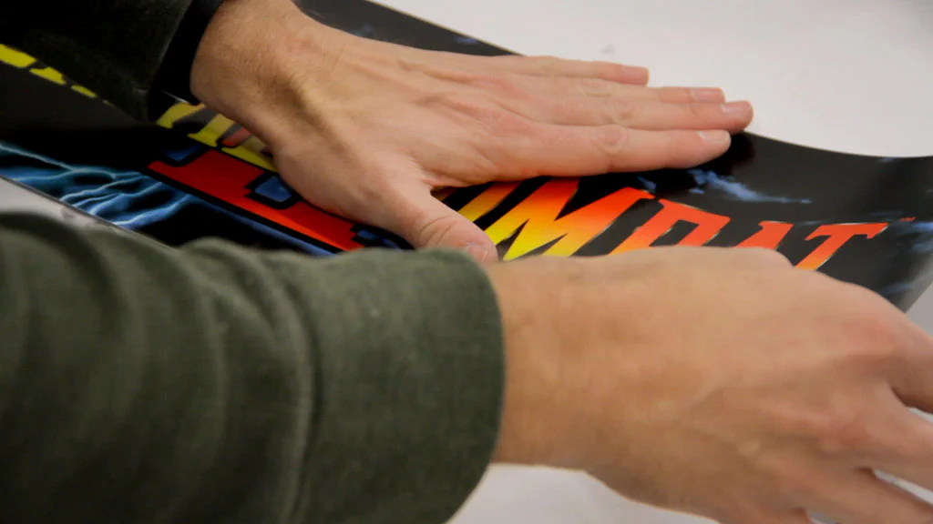 After sanding the edges smooth and cleaning any dust off, I applied the marquee to the sheet of acrylic. These marquees came with a peel-and-stick back, but you could also use a can of spray adhesive as well.