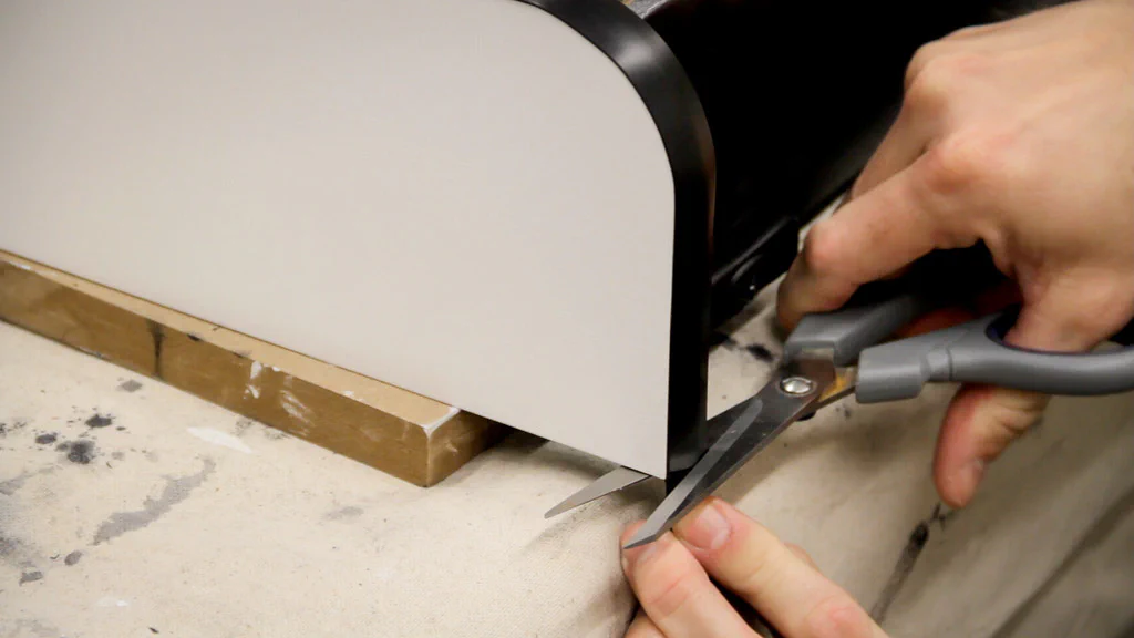 The next step was to add the T-molding to the front edges of the top, bottom, and outer sides. I just inserted it into the groove and if there was a spot that refused to lay flat, I added a little hot glue in the groove. When I reached the end, I just used a sharp pair of scissors to cut the molding.