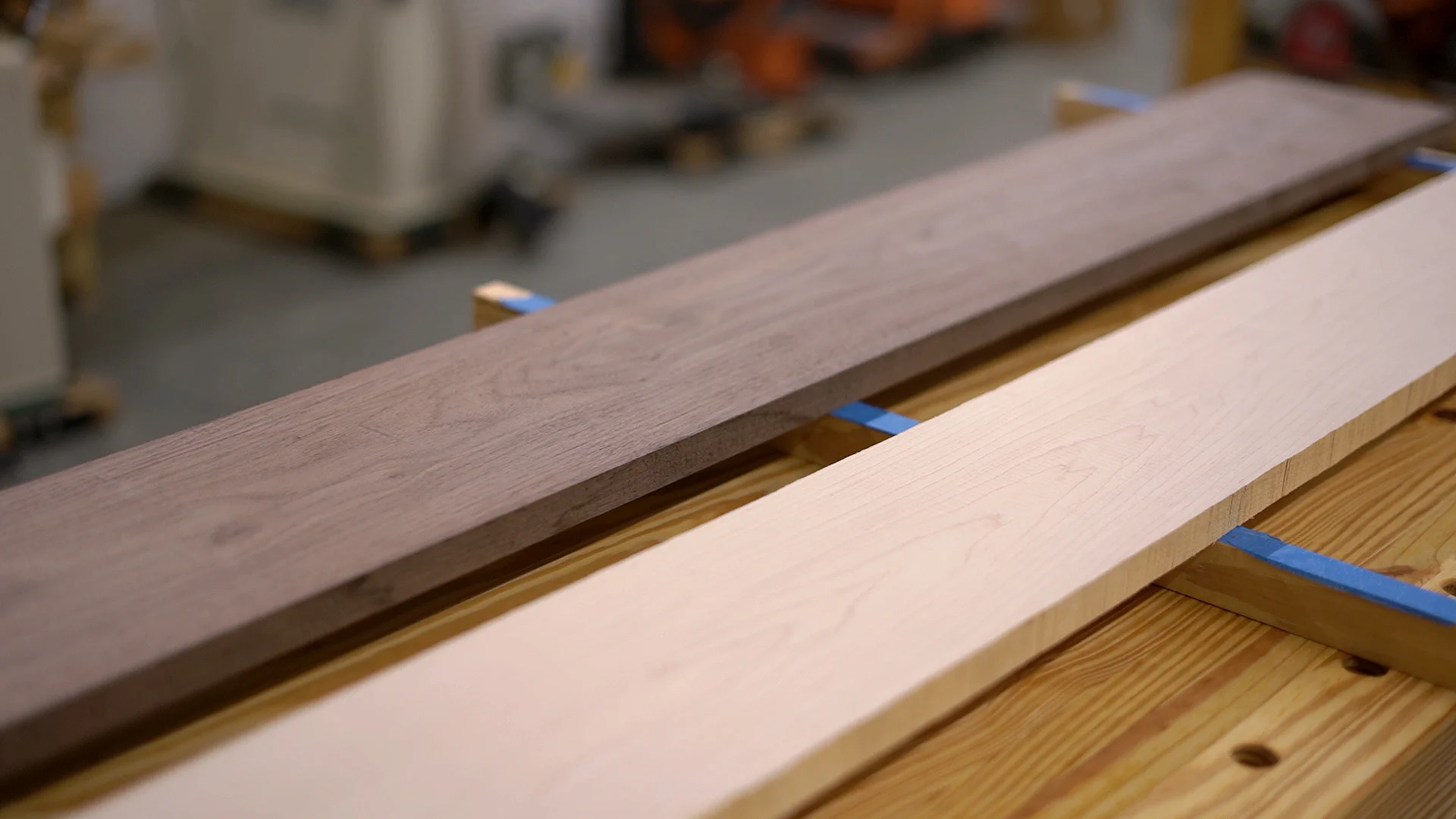 To get started, I went and picked up a pair of 6" - 7" wide hard maple and walnut boards at my local lumber yard. Since I wanted the final boards to be roughly 16" x 12" and at least 1.25" thick, I then cut the boards down to roughly 18" long at my miter saw.