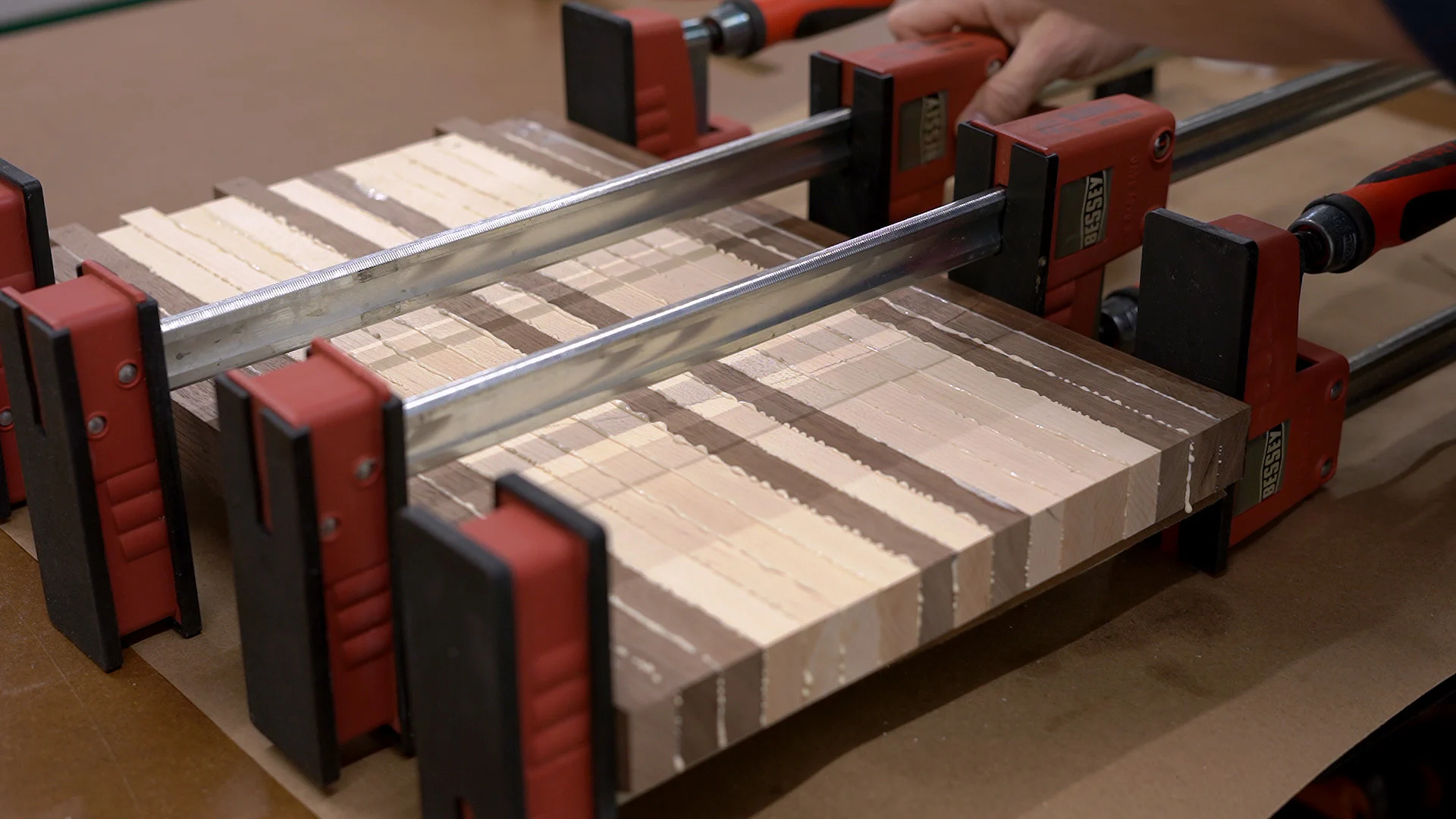 After experimenting with the layout for a bit, it was time for the first glue-up. I started by cutting a couple of pieces of paper and applied a little paraffin to keep excess glue off my clamps.