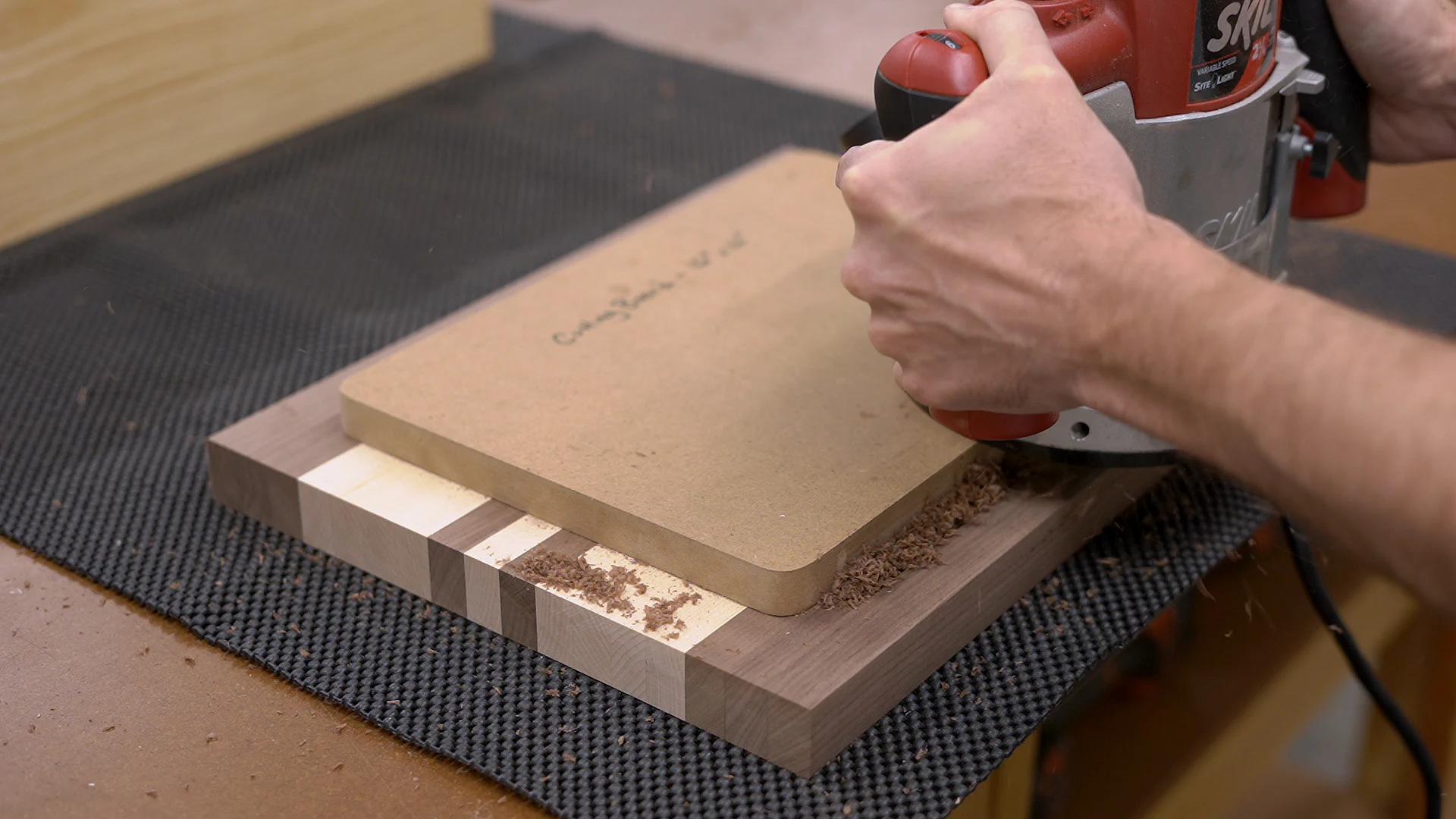 Another way to route juice grooves for rectangular boards is to create a set of four L-shaped pieces that can surround the outside of the cutting board. I made these from some scrap MDF for a different pair of boards and located the vertical pieces such that when the router base runs along them, the bit would cut a groove that was centered an inch inside the board.