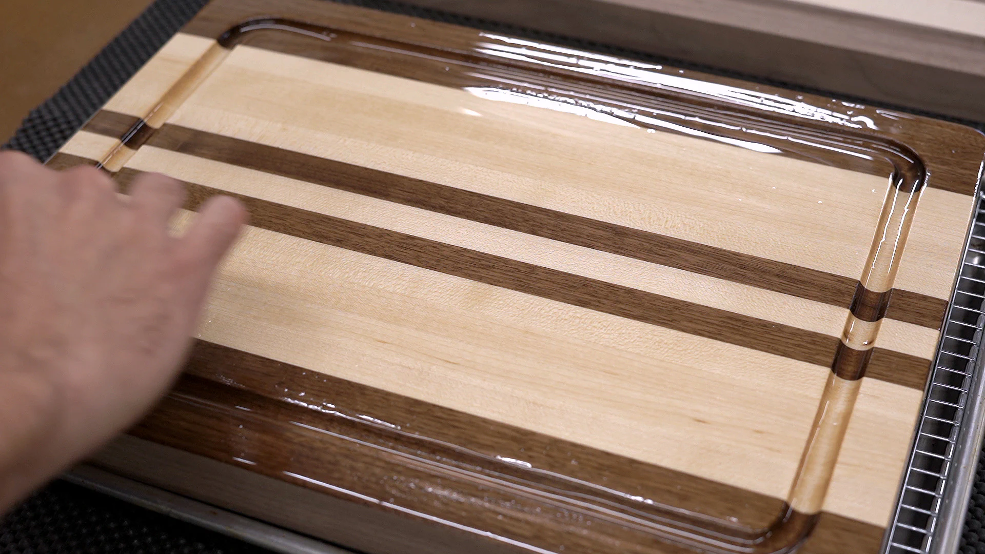 After more sanding using 120, 220, and 320 grit, I sprayed the cutting board lightly with water to raise the grain.