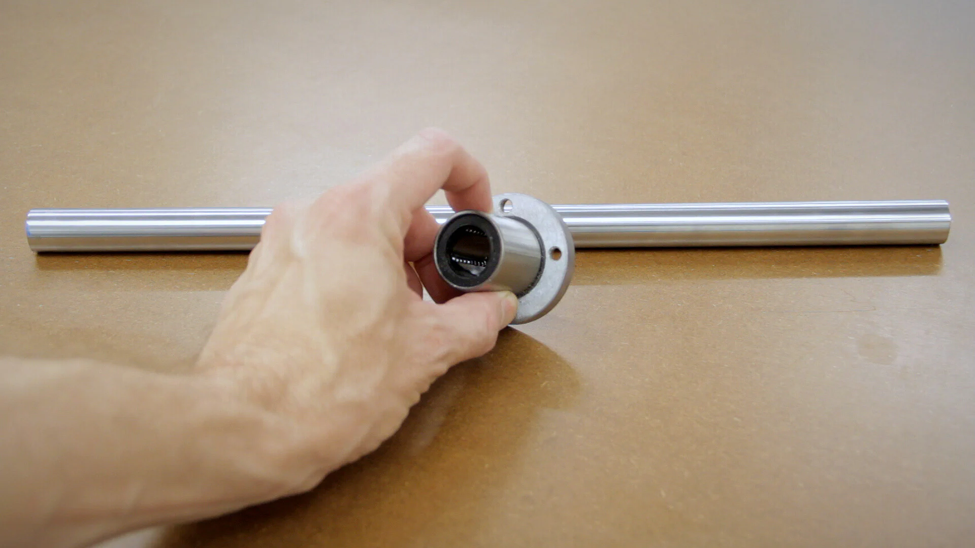 To recess the linear bearing, I started by drilling a larger, shallow hole in the leg a few inches up from the bottom on the front face of the leg. At the center of that hole, I drilled another one that was just slightly larger than the bearing’s cylinder so that there would be a small amount of wiggle room to make mounting it perpendicular to the leg face a bit easier.