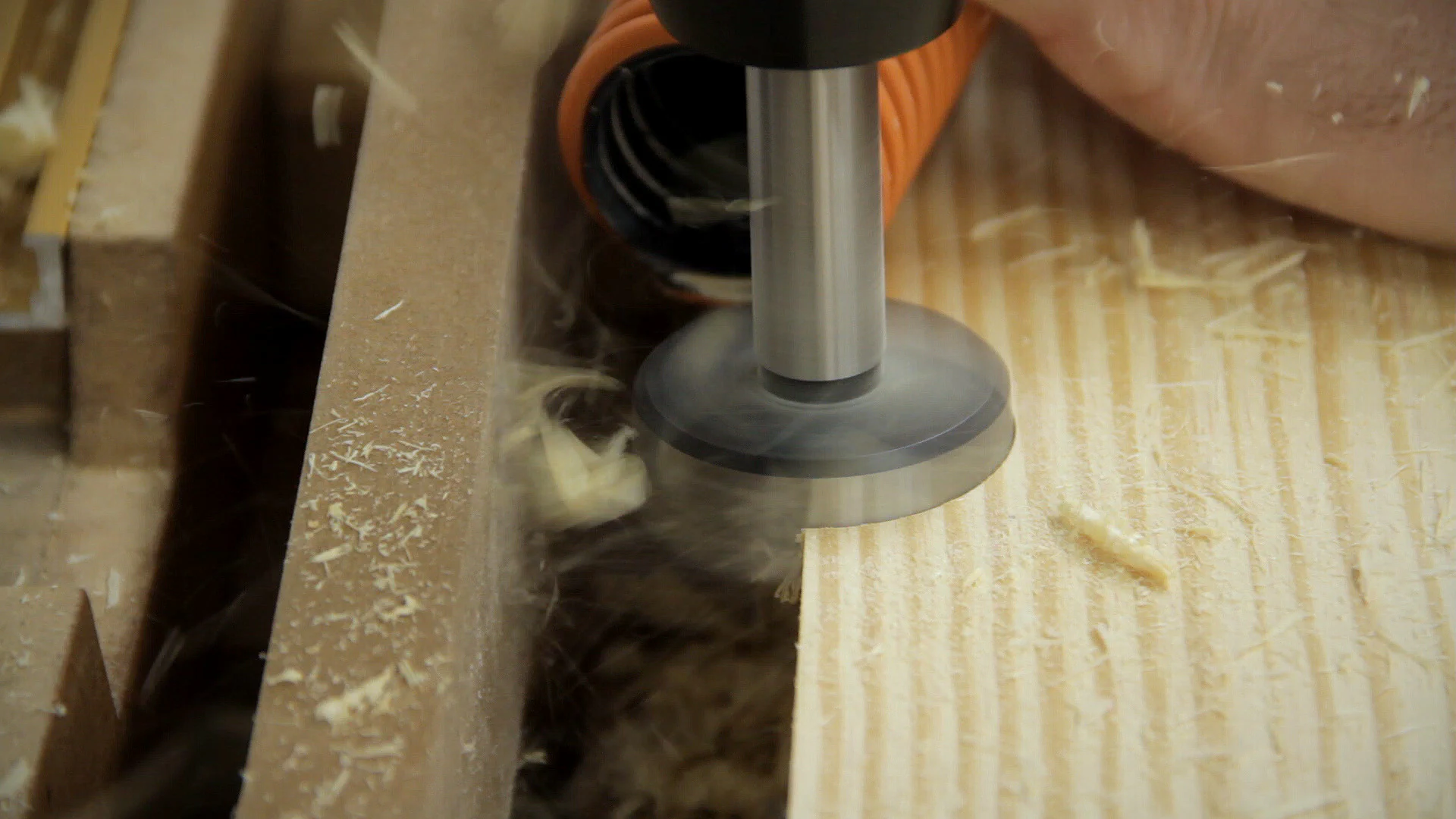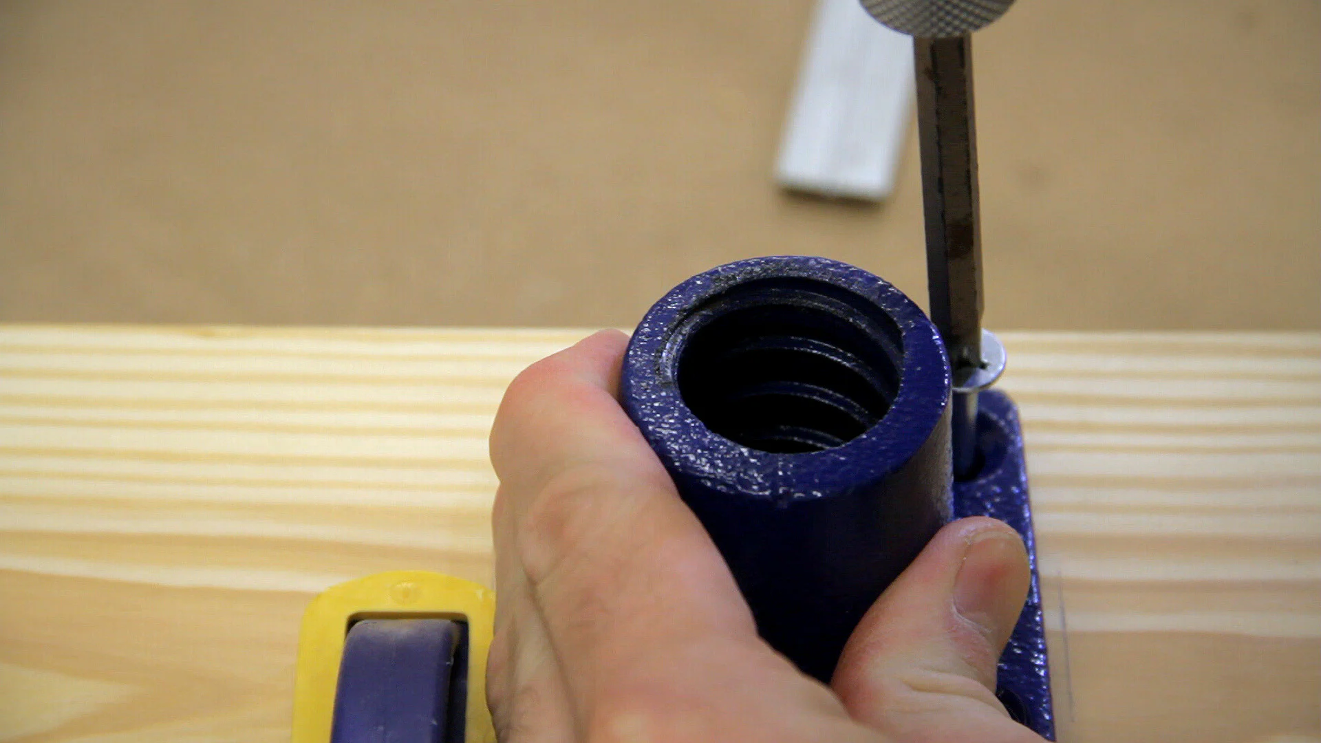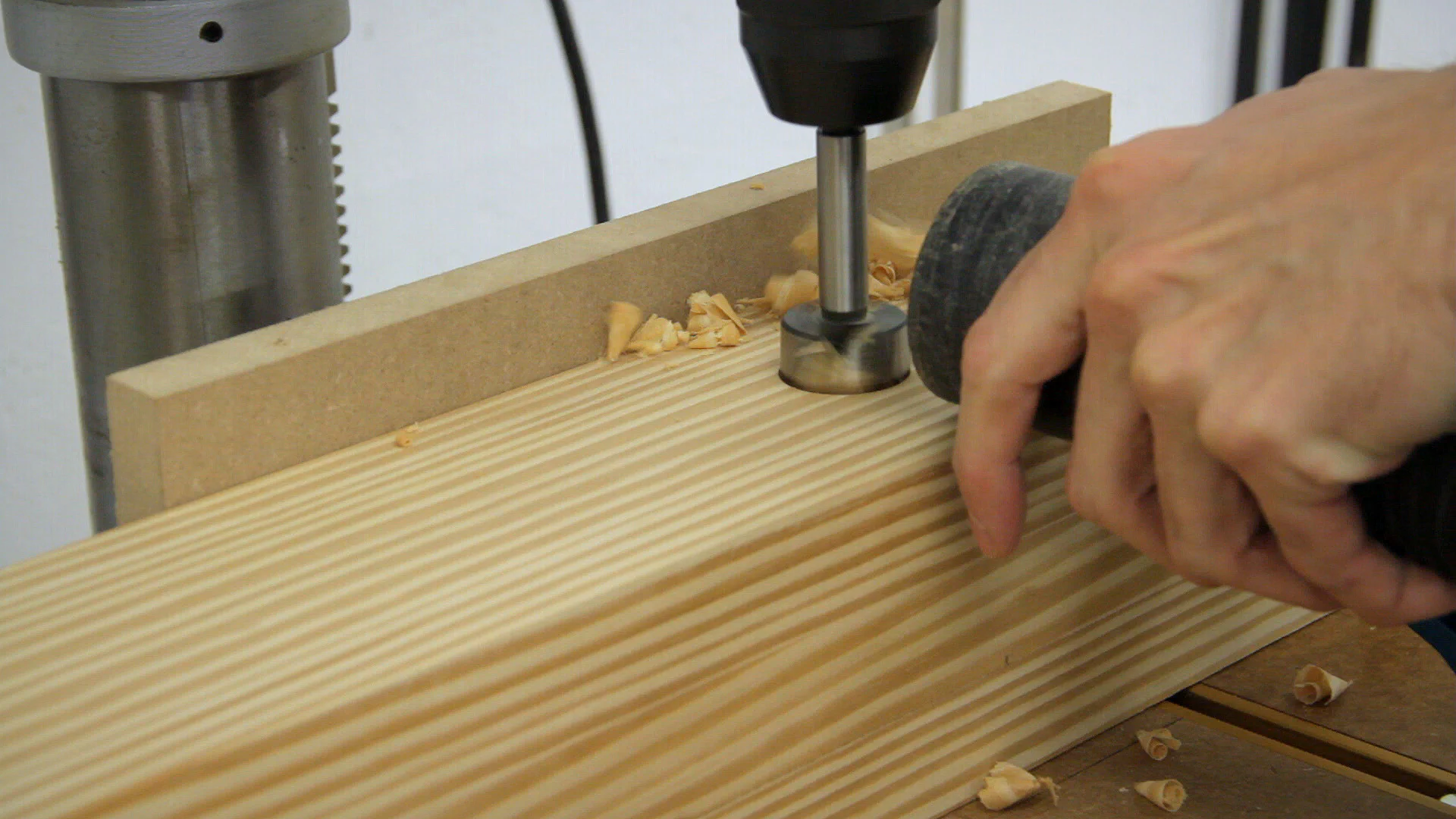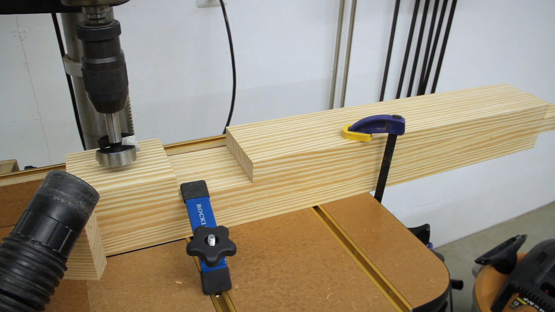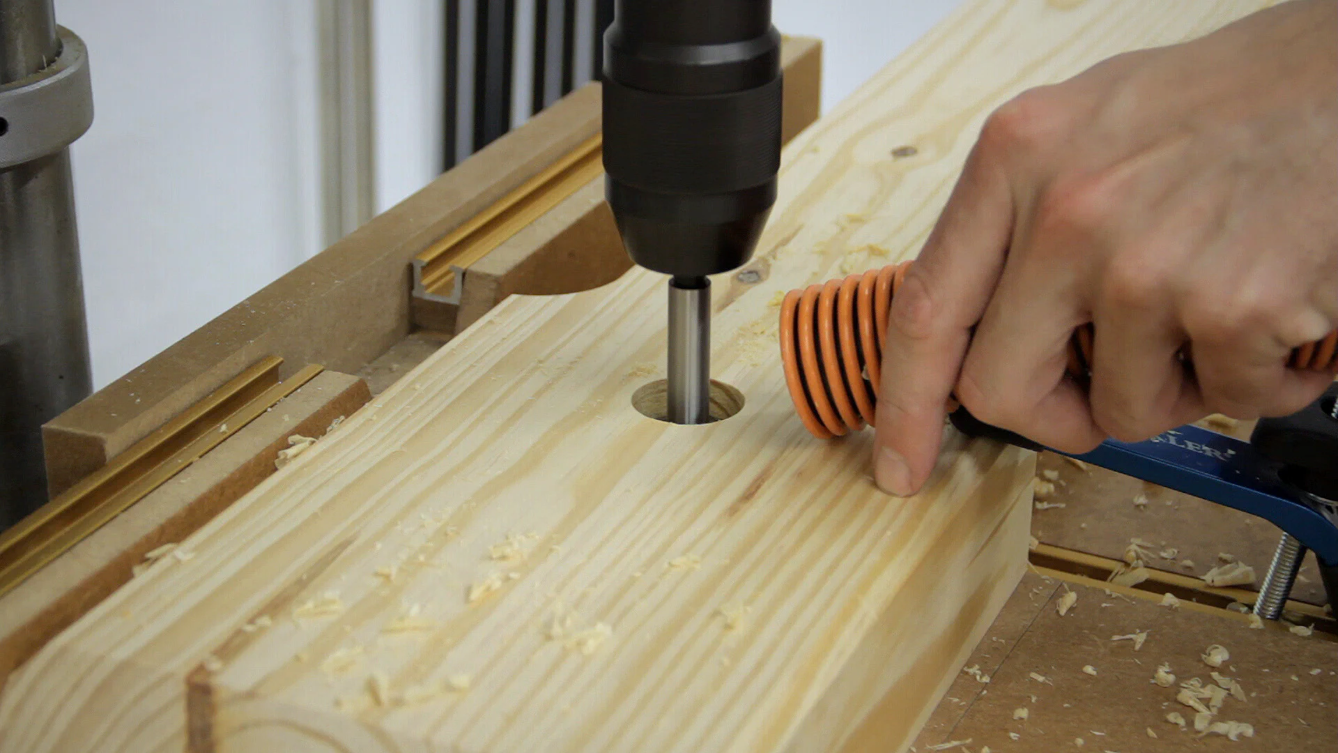 Next, with the chop tightened against the bench leg and centered along the bottom, I inserted the Forstner bit that matched the bearing size and marked on the back of the chop the location for the shaft and drilled a 2" hole at the drill press.
