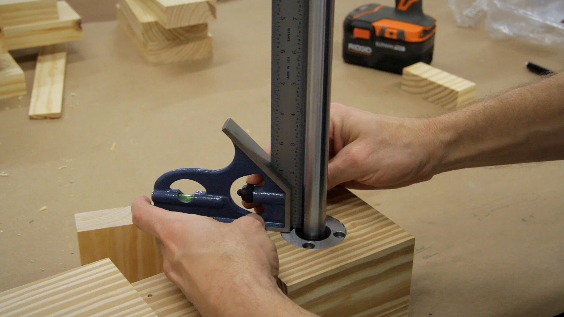 Next, I double checked that the linear bearing was perpendicular to the front face of the leg and made a few slight adjustments with the Forstner bit in my cordless drill before pre-drilling and screwing it to the leg.