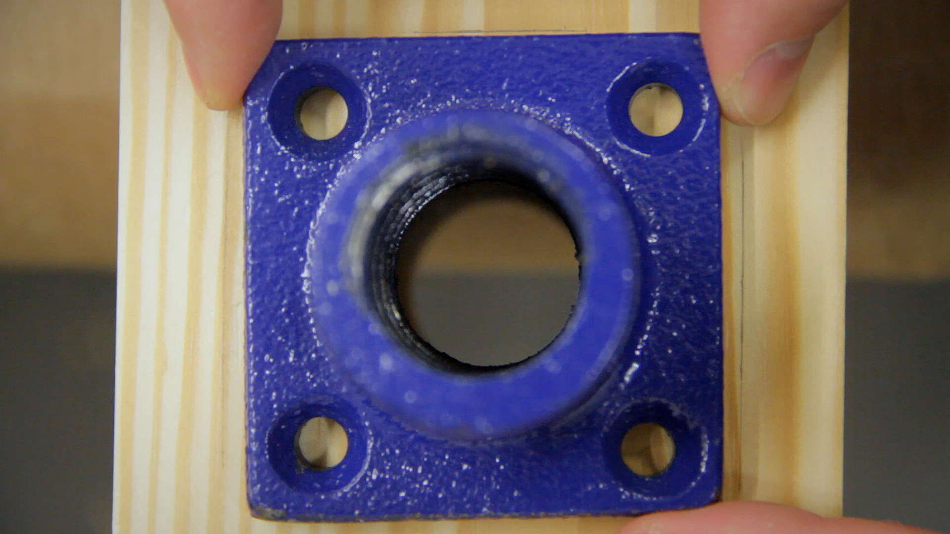 Then I mounted the vise-screw’s collar to the rear of the leg using four 3" #14 screws. To center the collar opening with the hole in the leg, I mostly just eye-balled it from above while making a few marks at the extents. After marking the hole locations, I then pre-drilled and screwed it in place.