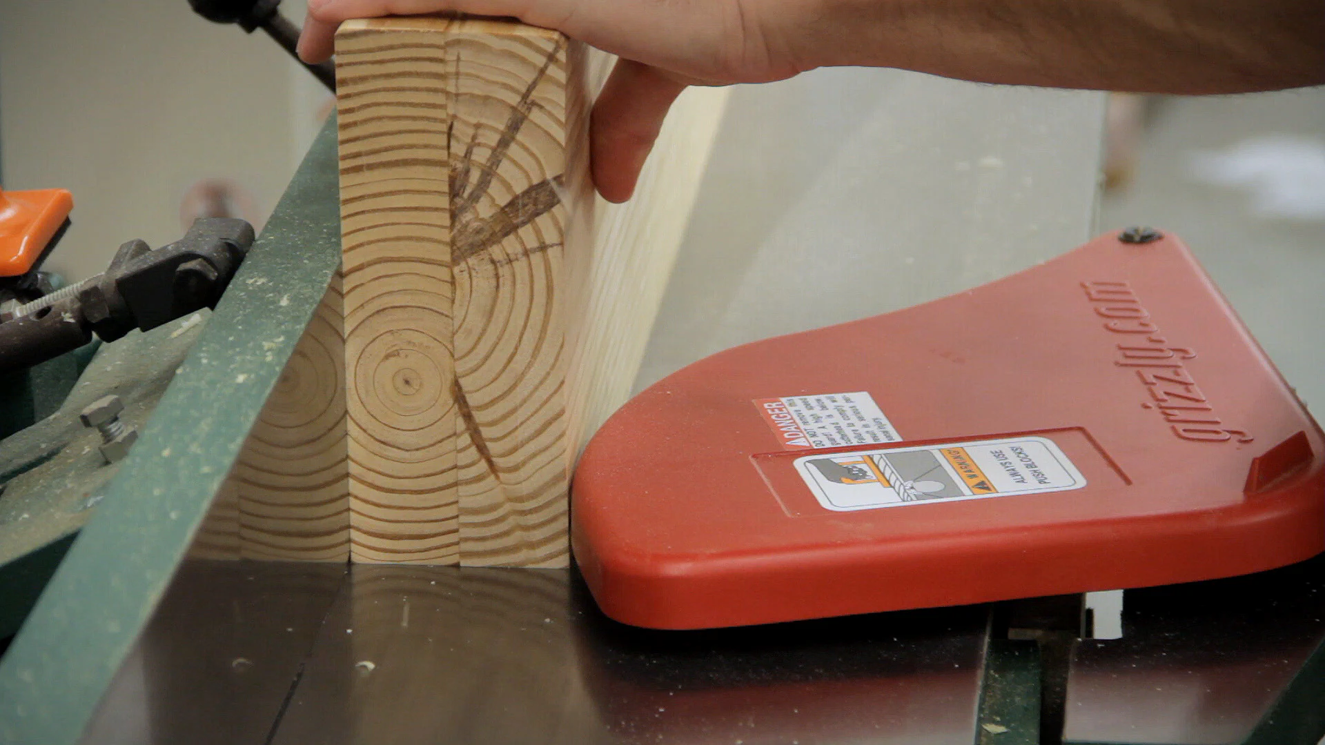 Next, it was time to work on the chop. I started by rough-cutting a 2x8 into two pieces at the miter saw. I then ran one face from each piece through the jointer and then glued the two pieces together to form one thick piece.