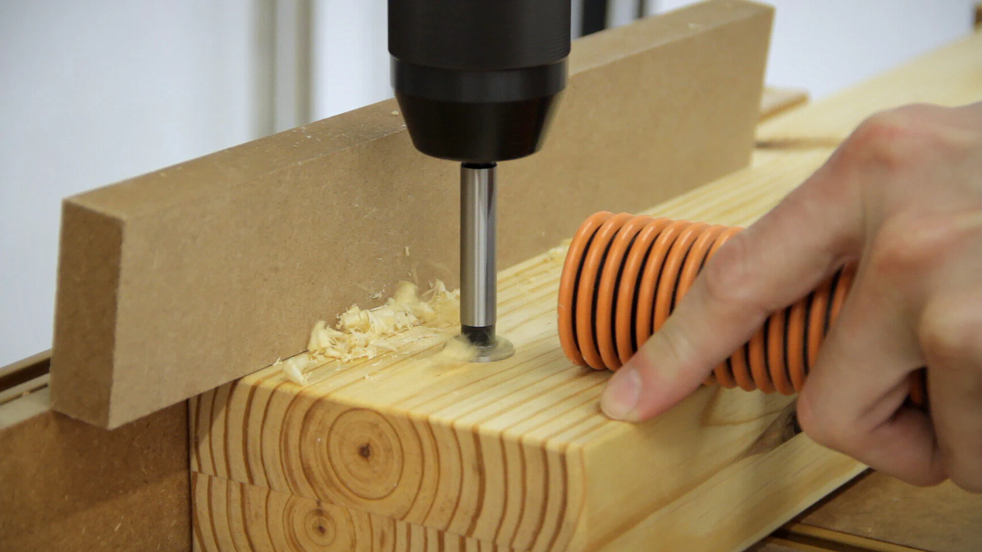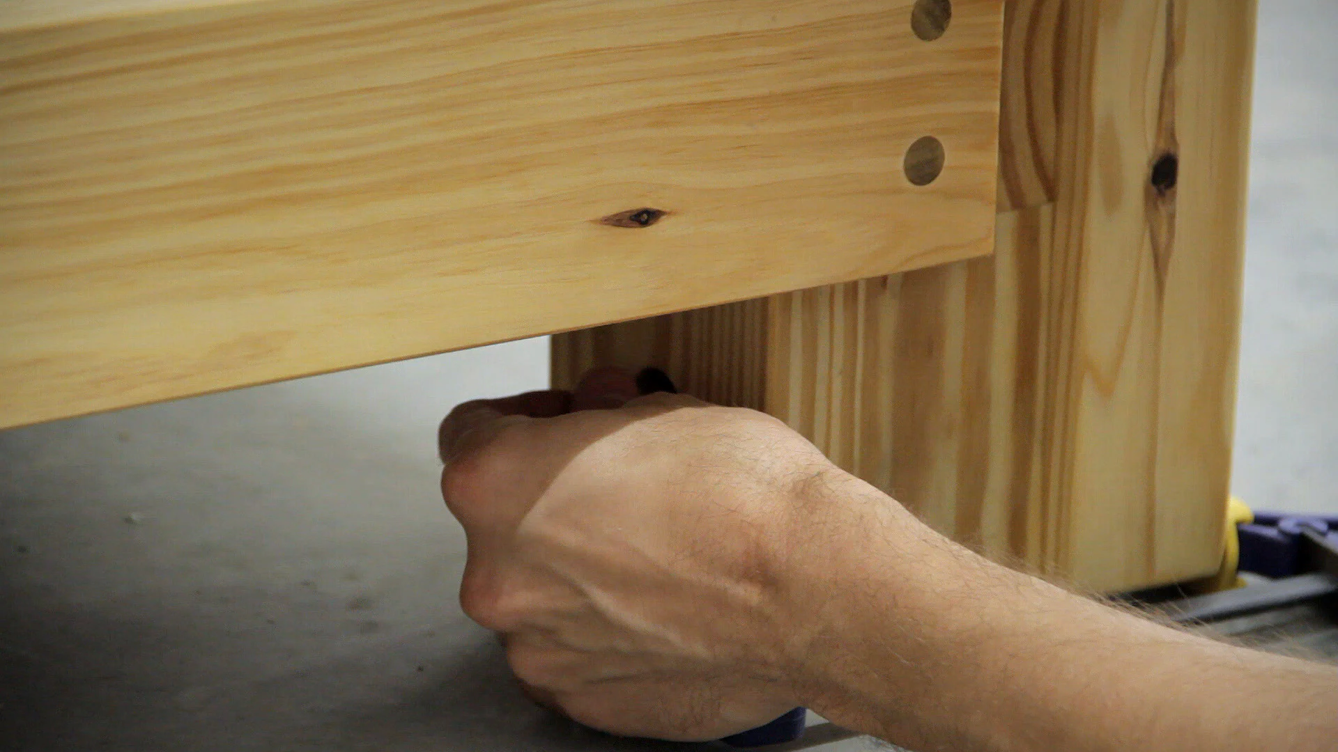 The solution was to simply use a piece of wood as a guide to help keep the shaft perpendicular to the leg face. To do this, I removed the shelf and since I’d already glued the inner stretcher in place, I drilled a couple of holes through it and then attached the guide with screws to the outer stretcher.