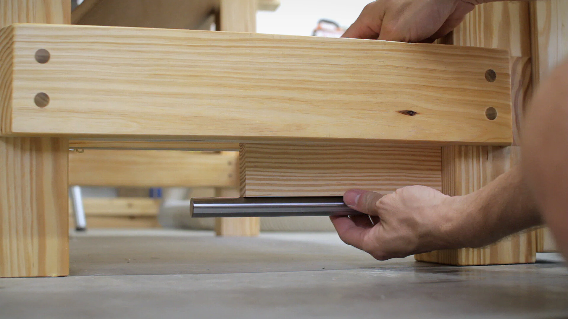 After completing the main workbench, it was time to add a couple of vises. First up is a sturdy leg vise built from a single 2x8 board, a vise screw, and a linear bearing and shaft. With a few minor tweaks, it opens and closes easily and can exert a tremendous amount of pressure to hold any work-piece securely.
