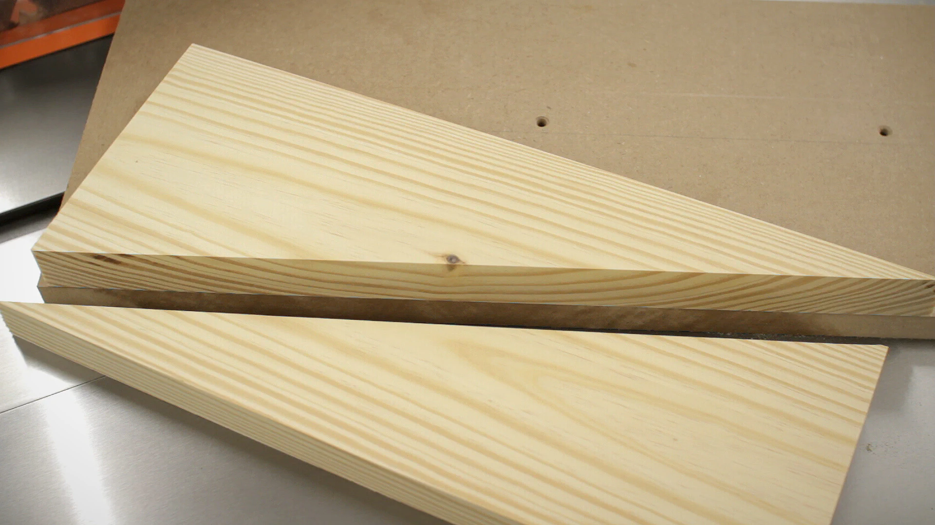 I surfaced another scrap piece of wood and cut it to 16" long by 6" wide to match the roughly 4" wide by 1.5" deep cut that I would be making in the vise chop. I then used some double-sided tape to secure it to a piece of MDF to act as a tapering jig at the table saw.