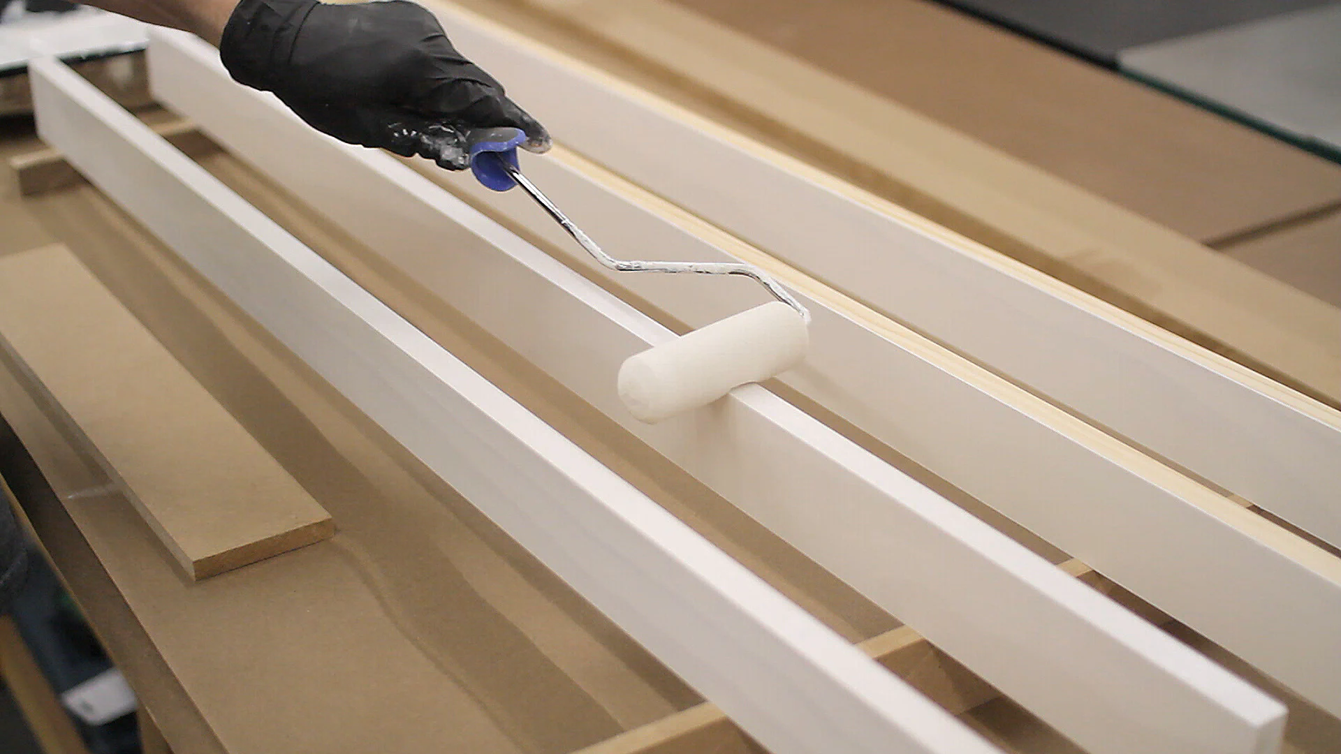 To prevent any bleed-through of grain and knots on the pine parts, I decided to use a shellac-based primer for everything. It’s pretty runny, but applying two coats with a 4" foam roller was fast because of its quick drying time.