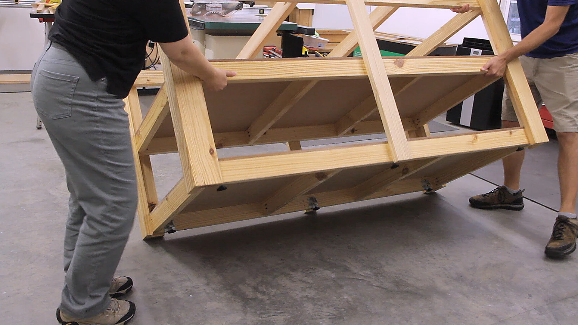 Since I’ll be building a second Roubo-style workbench for hand-tool work, I wanted this one to work well for assembling and finishing projects. This meant having a large, flat top that wouldn’t immediately soak up paint and glue. And in order to meet the outfeed support requirements, I wanted it to have adjustable feet so that the top could be leveled with my table saw. I also couldn’t pass up the opportunity for more storage, so I decided to include two large shelves. After a little design work in SketchUp, it was time to start building!