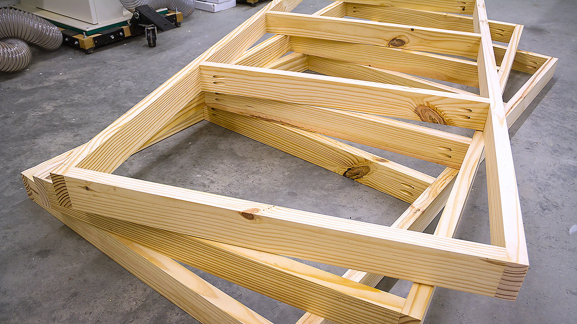 The legs and frames for the shelves and top were built using six 2"x8"x8’ boards and one 2"x10"x8’ board. They certainly could have been built using 2"x4" lumber, but finding that many nice boards would be challenging and around here they don’t come in southern yellow pine.