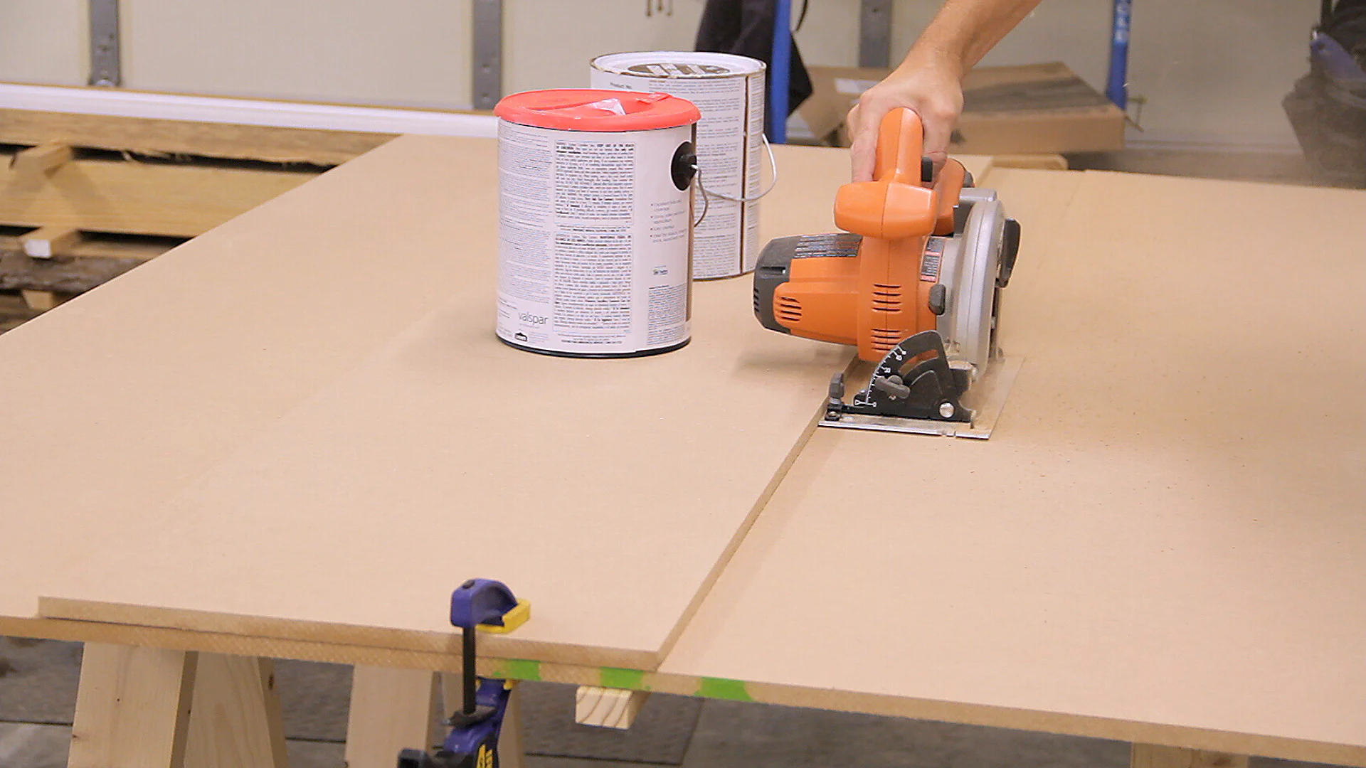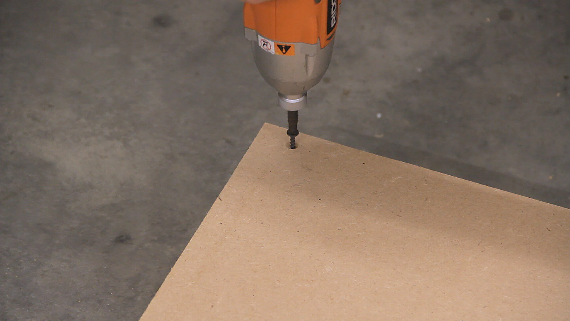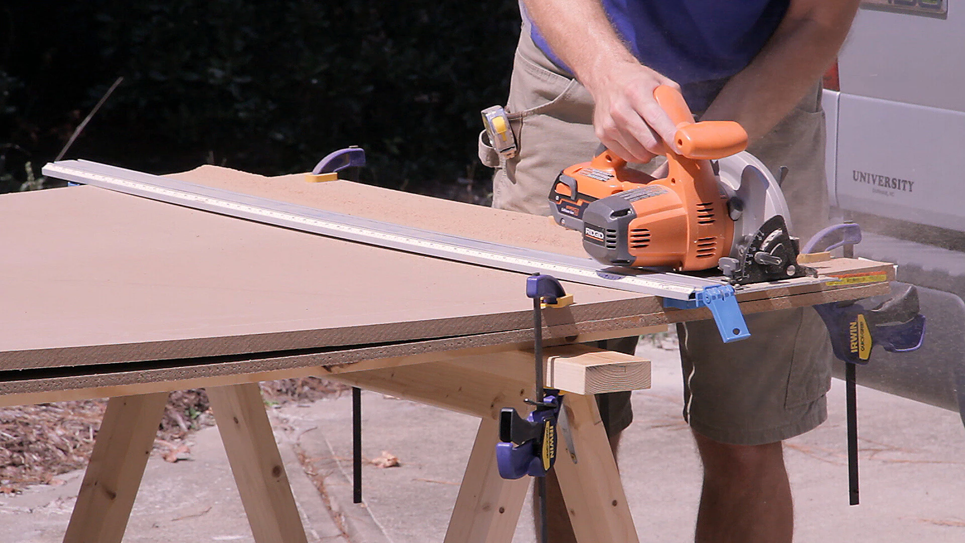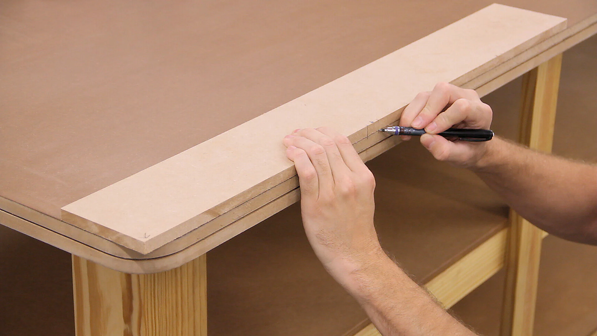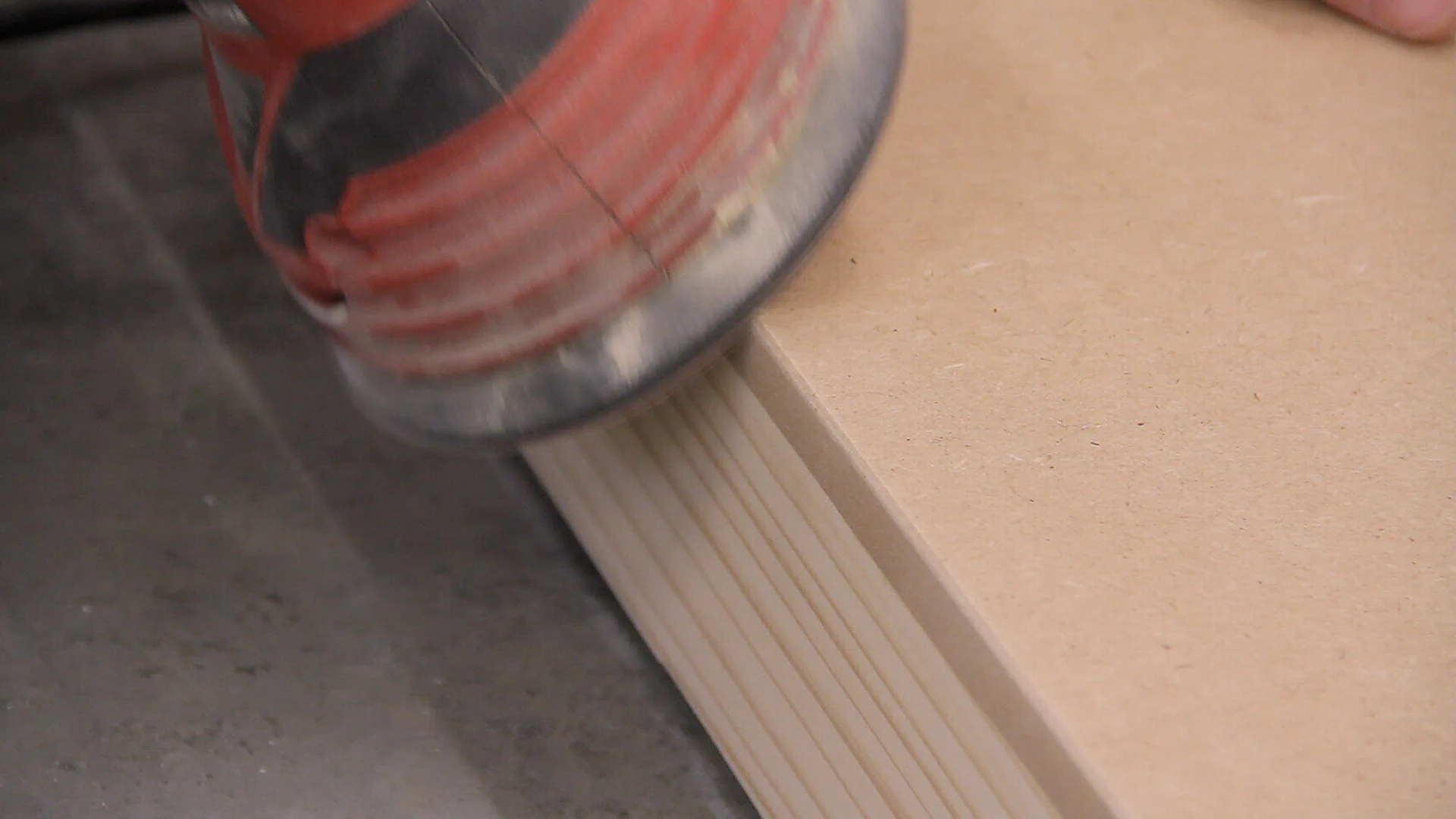 To do this I started by clamping a 3/4" and 1/2" piece of MDF together so that I could cut both pieces at once. After positioning the 3/4" piece on the workbench frame, I then countersunk screws into it roughly every 10" and sanded all the holes flush with a sanding block.