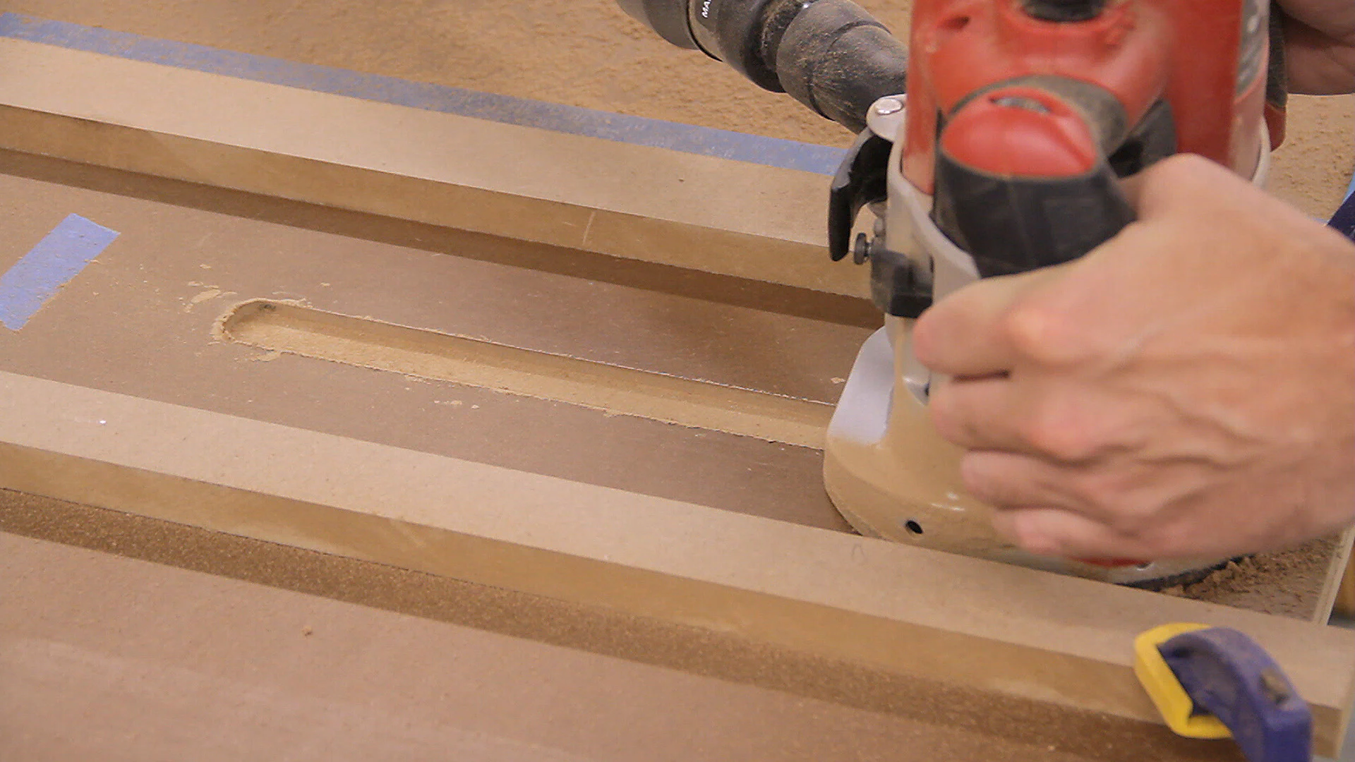 The next step was to route a slot using a slot-cutting bit for the T-molding. This can be pretty dusty, so I definitely recommend a nice respirator and good eye protection. To get the bit height correct, I clamped a scrap piece of 1/2" and 3/4" MDF together and did a few test passes until the slot was perfectly centered.