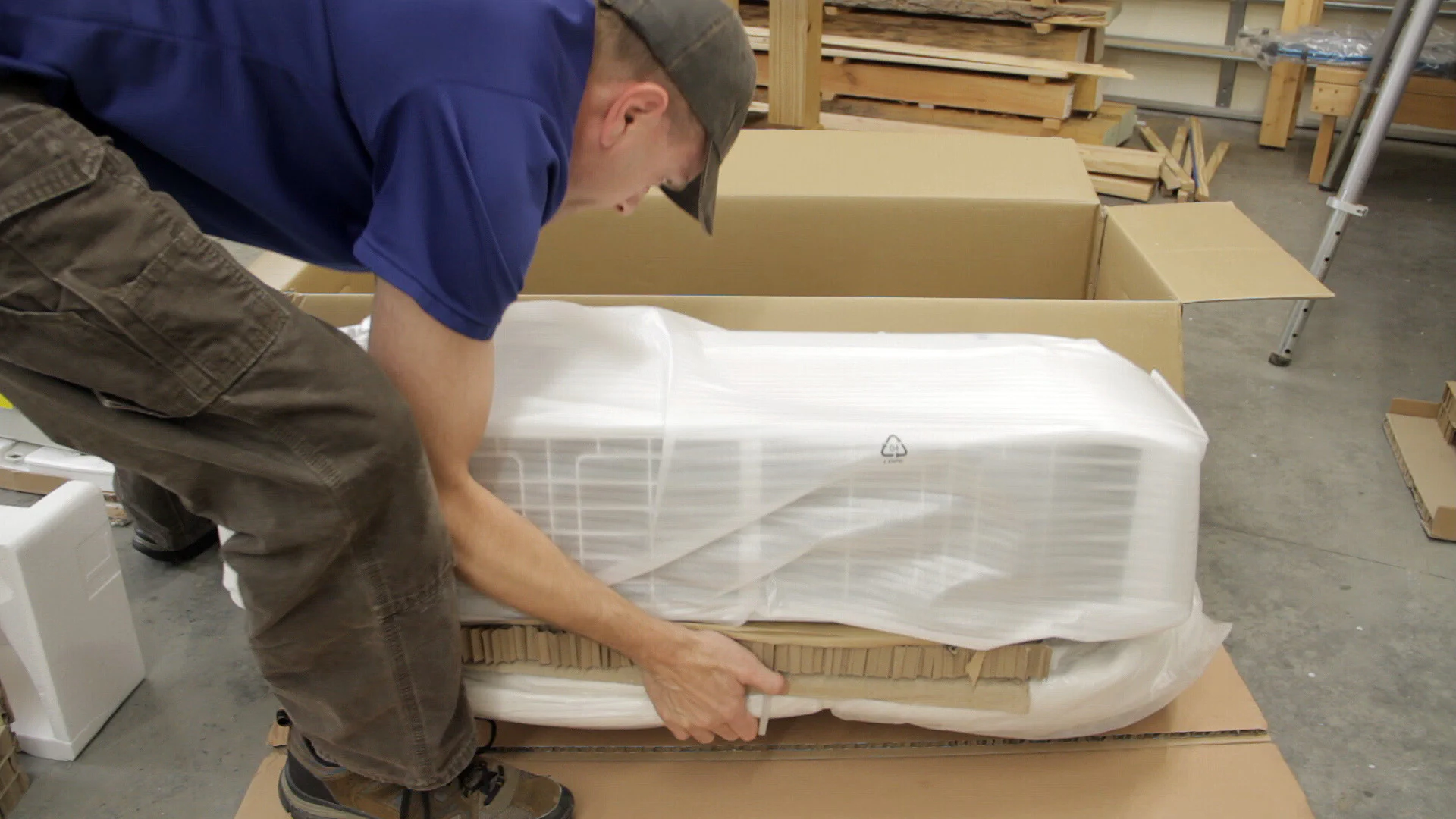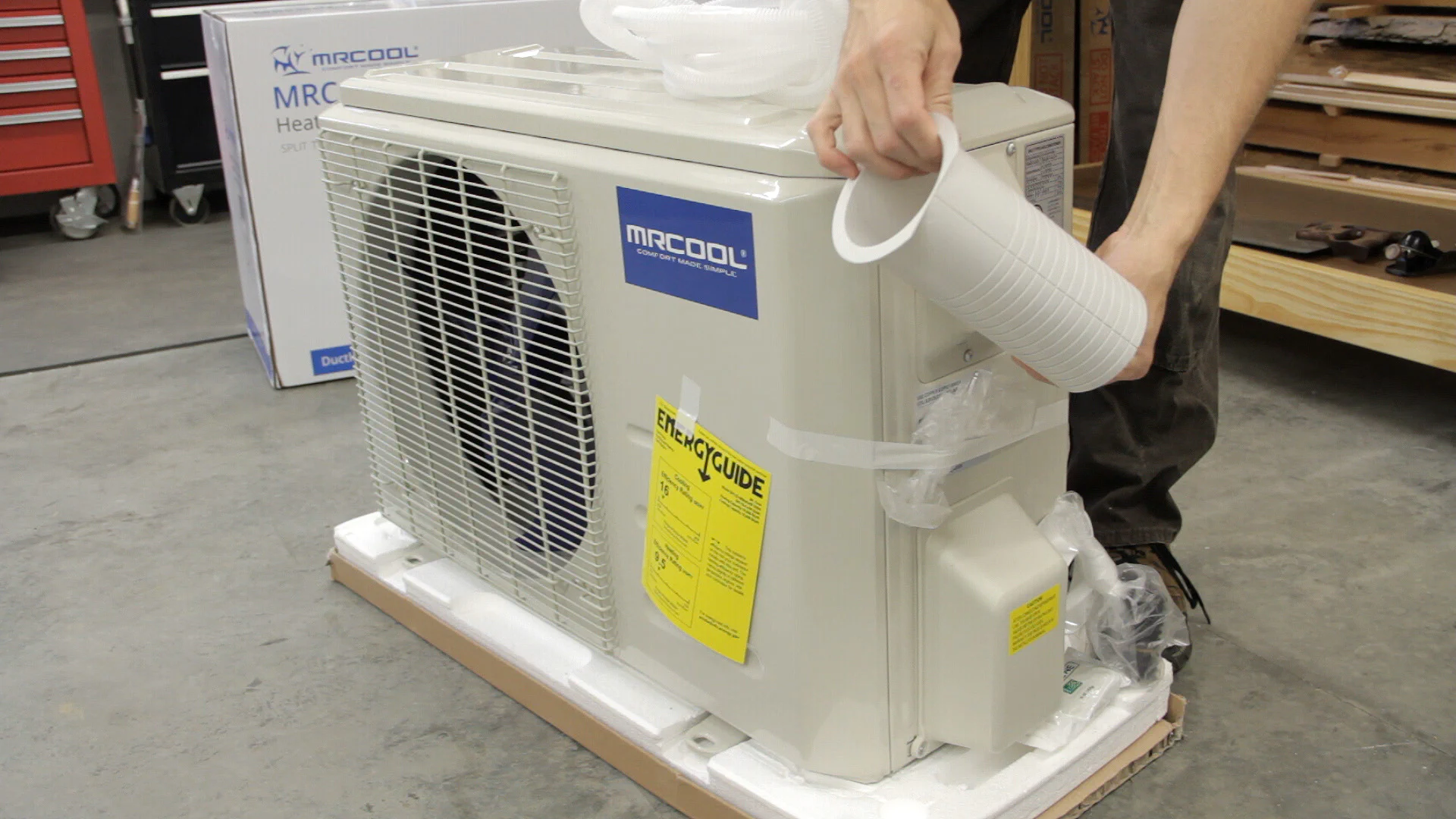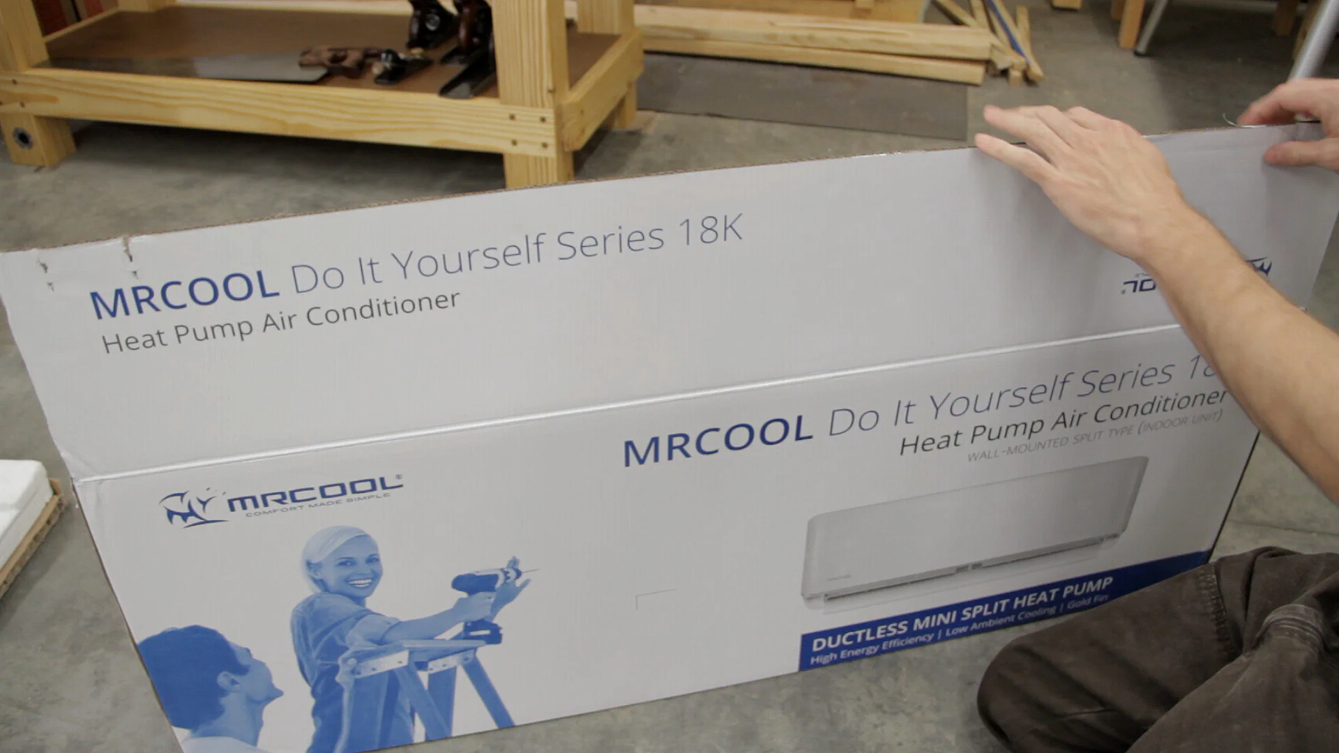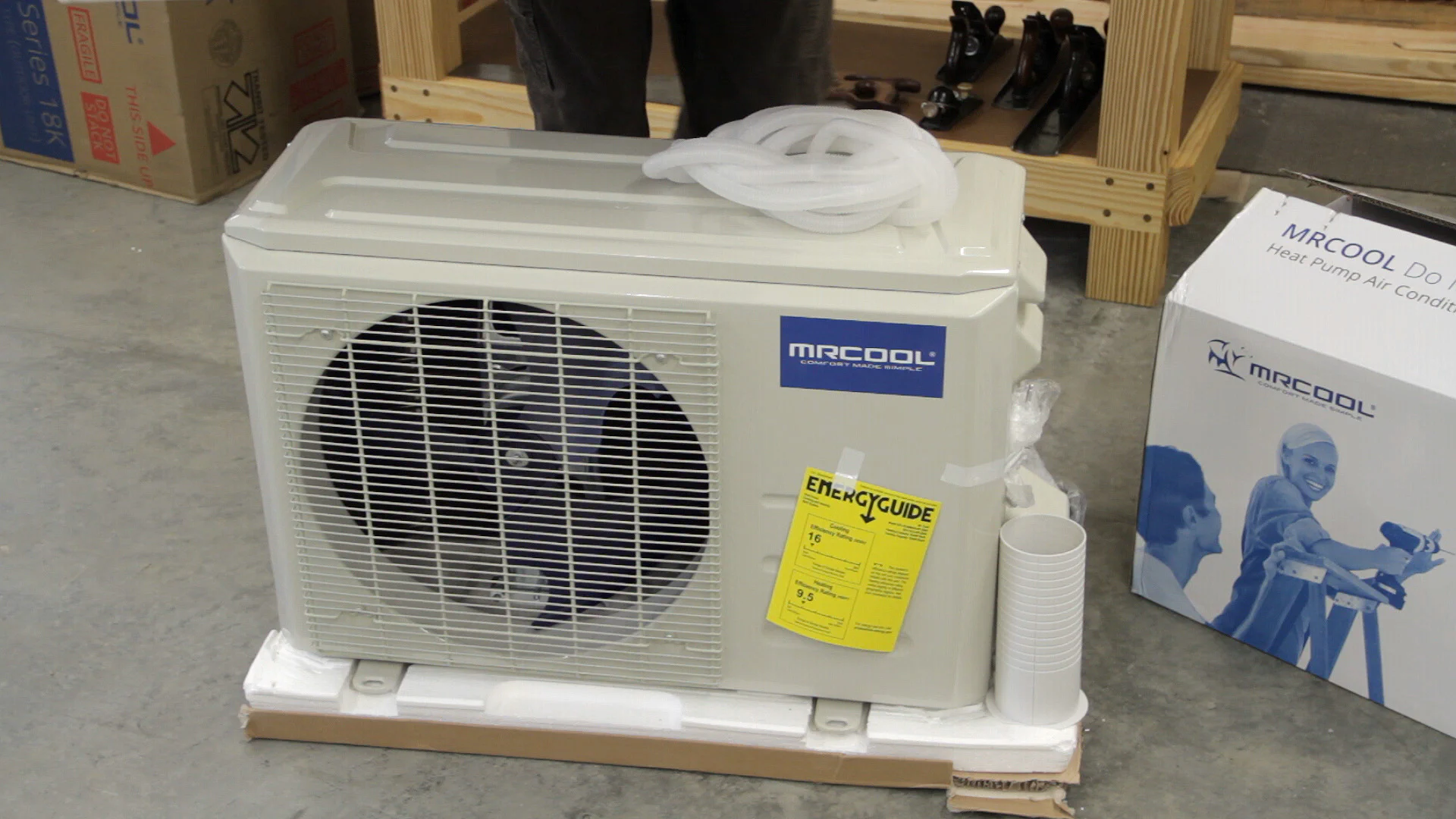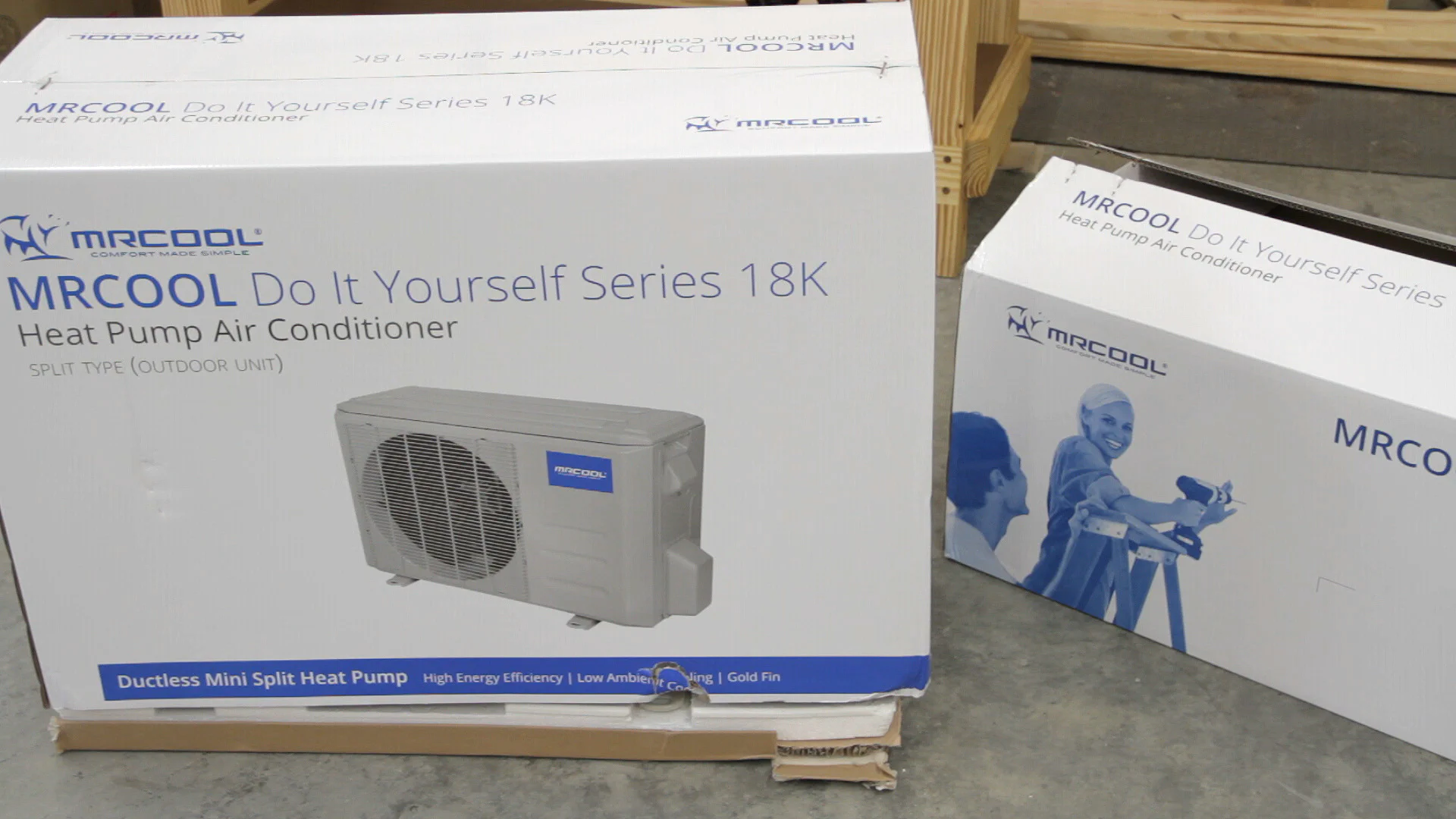The heat pump came in two boxes. The larger box is for the outdoor condenser unit which is usually placed on a small pad or installed on an exterior wall using a mounting bracket and then wired to a dedicated 120V or 240V circuit depending on the size of the unit.