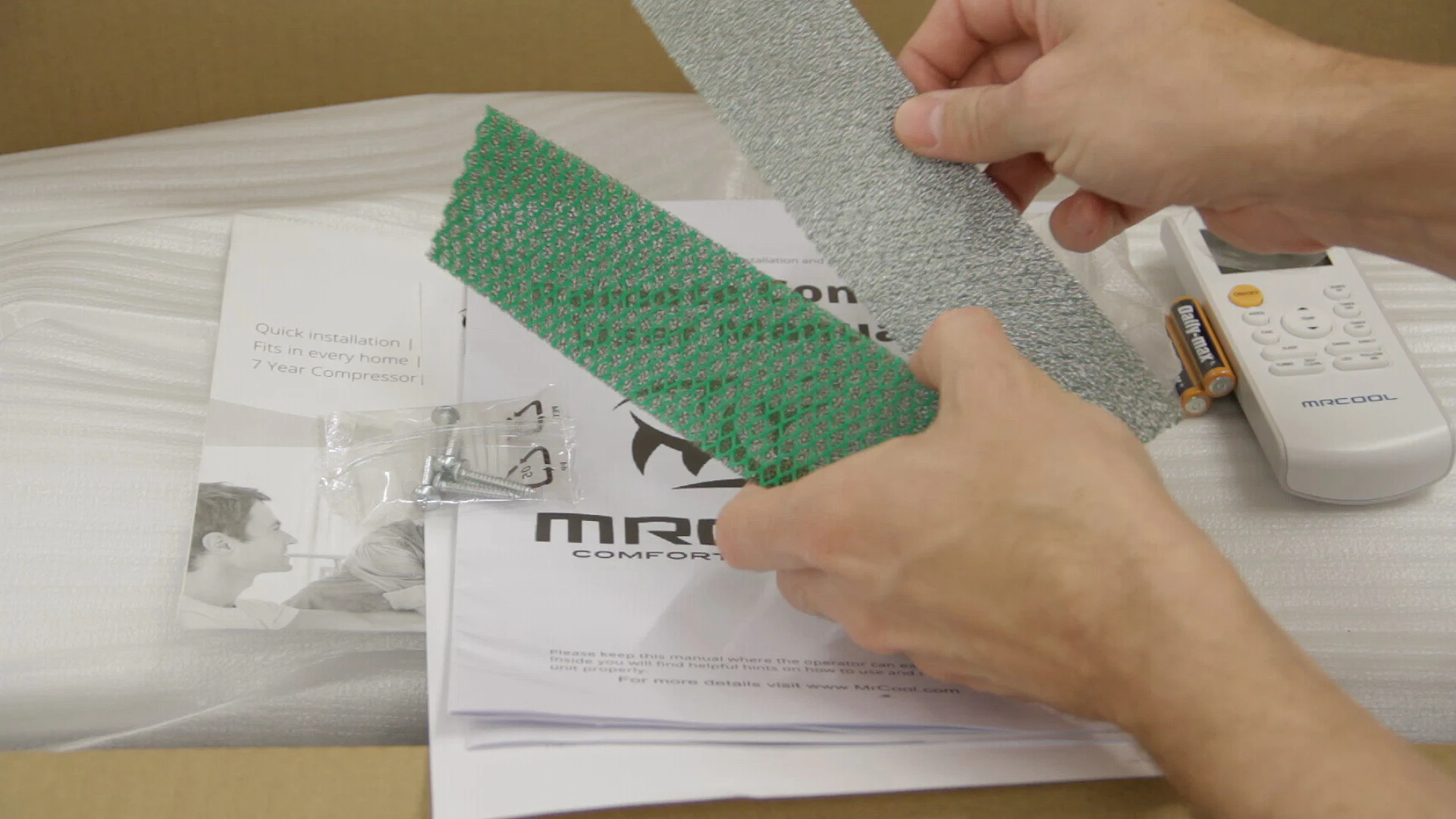 The indoor unit box contains the user manual, filters, the remote control, a drain connector for the condenser, and the Wi-Fi adapter. It also contains a cardboard template for the mounting plate with the location of the hole that must be cut in the wall.