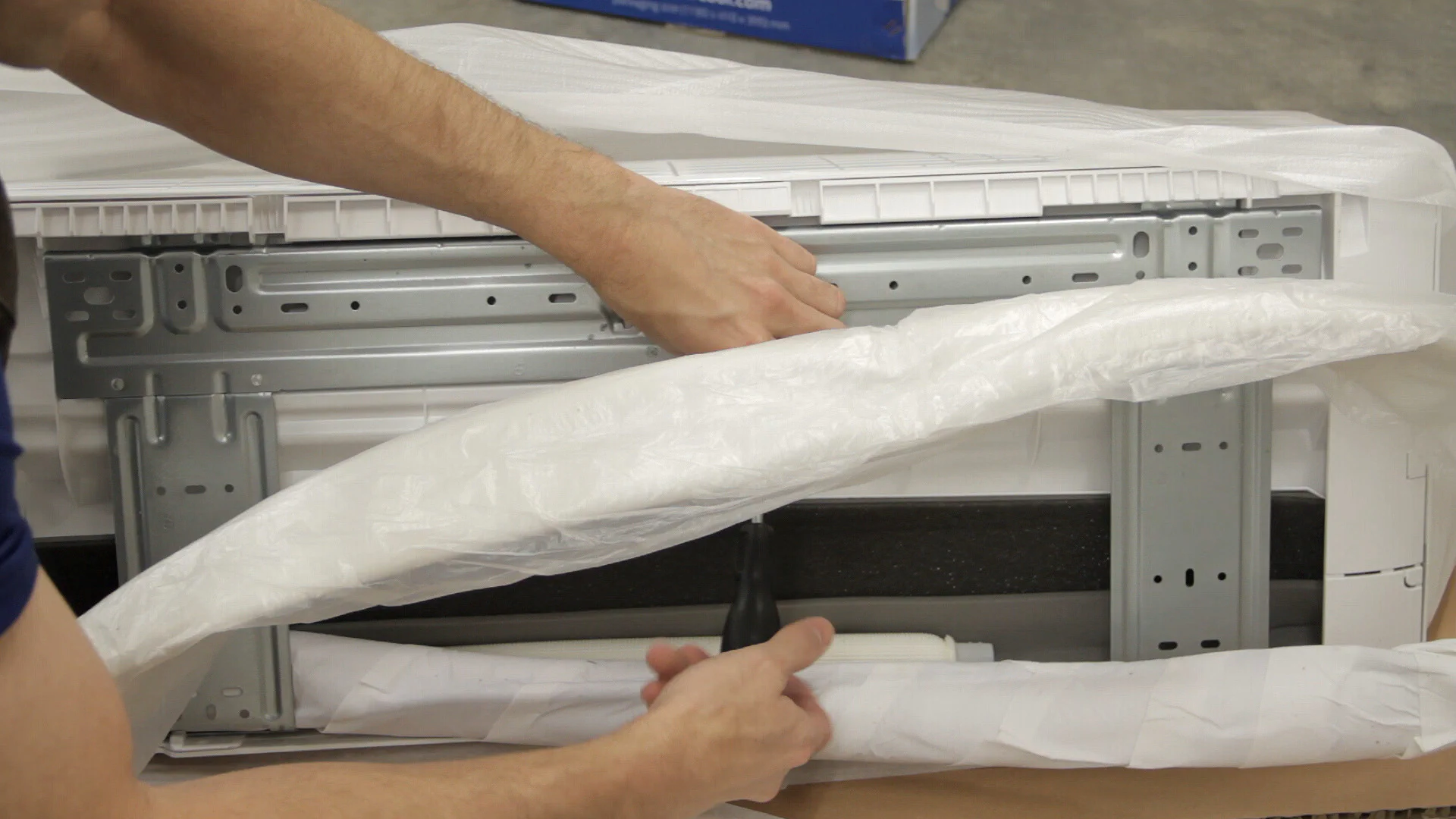 I started the installation by removing the indoor unit with the attached line set from the box. After removing the zip ties holding the lines together, I removed the metal mounting bracket from the back of the unit and uncoiled some of the lines being careful not to kink them.