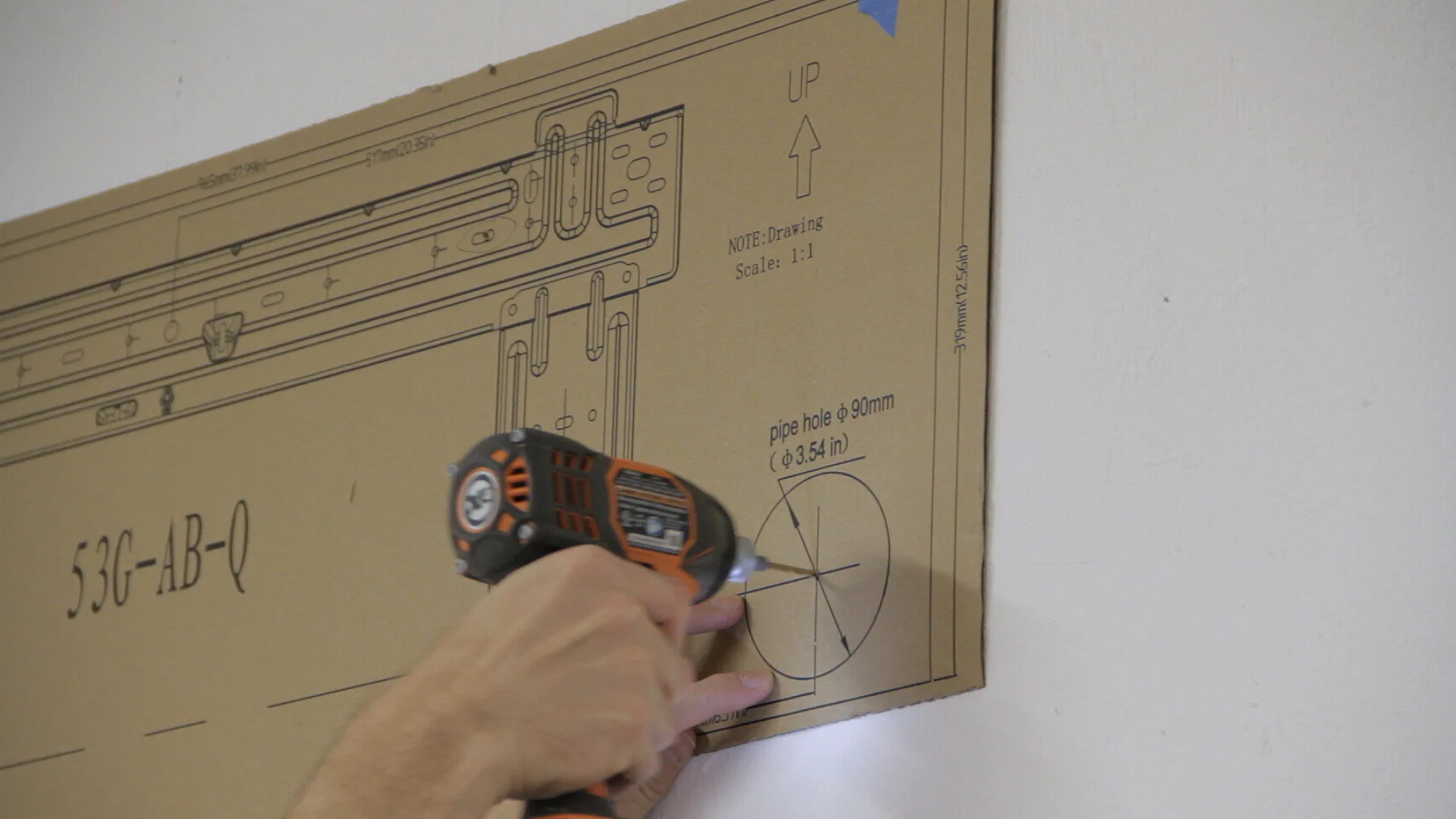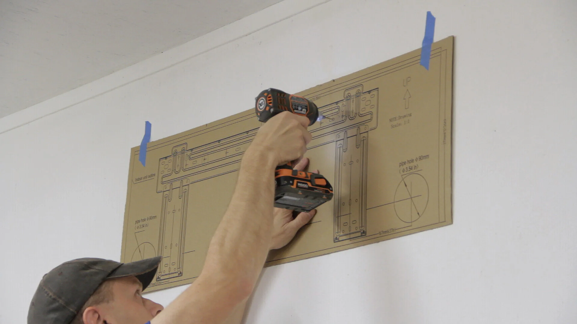 Then I leveled and taped the template to the wall of our shop and pre-drilled holes on two stud locations. I also went ahead and drilled a pilot hole where the hole for the line set would go before attaching the mounting bracket to the wall with a pair of cabinet screws.