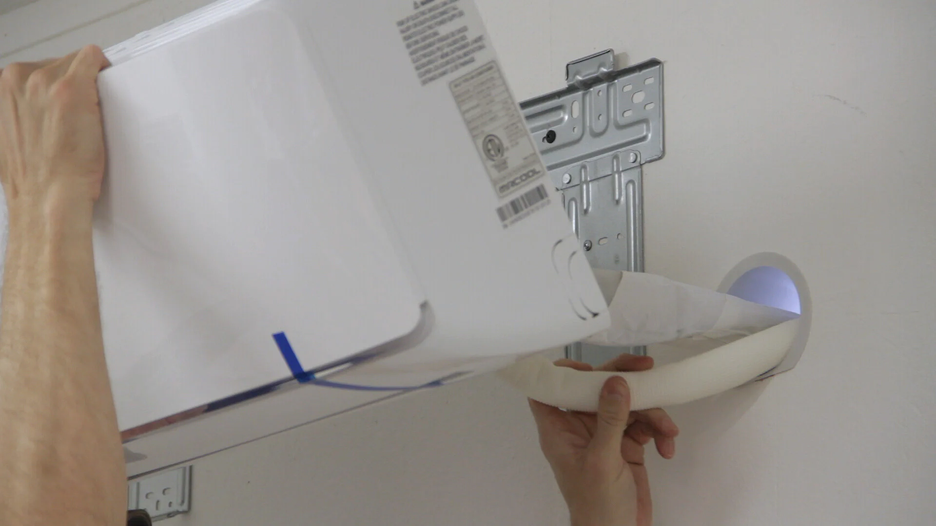 The second box contains the indoor unit which is mounted to an interior wall. Connected to it is a set of refrigerant lines and a power line that are run through a hole in the wall down to the outdoor unit. There’s also a small drain line connected to it that carries off any condensation from the indoor unit.