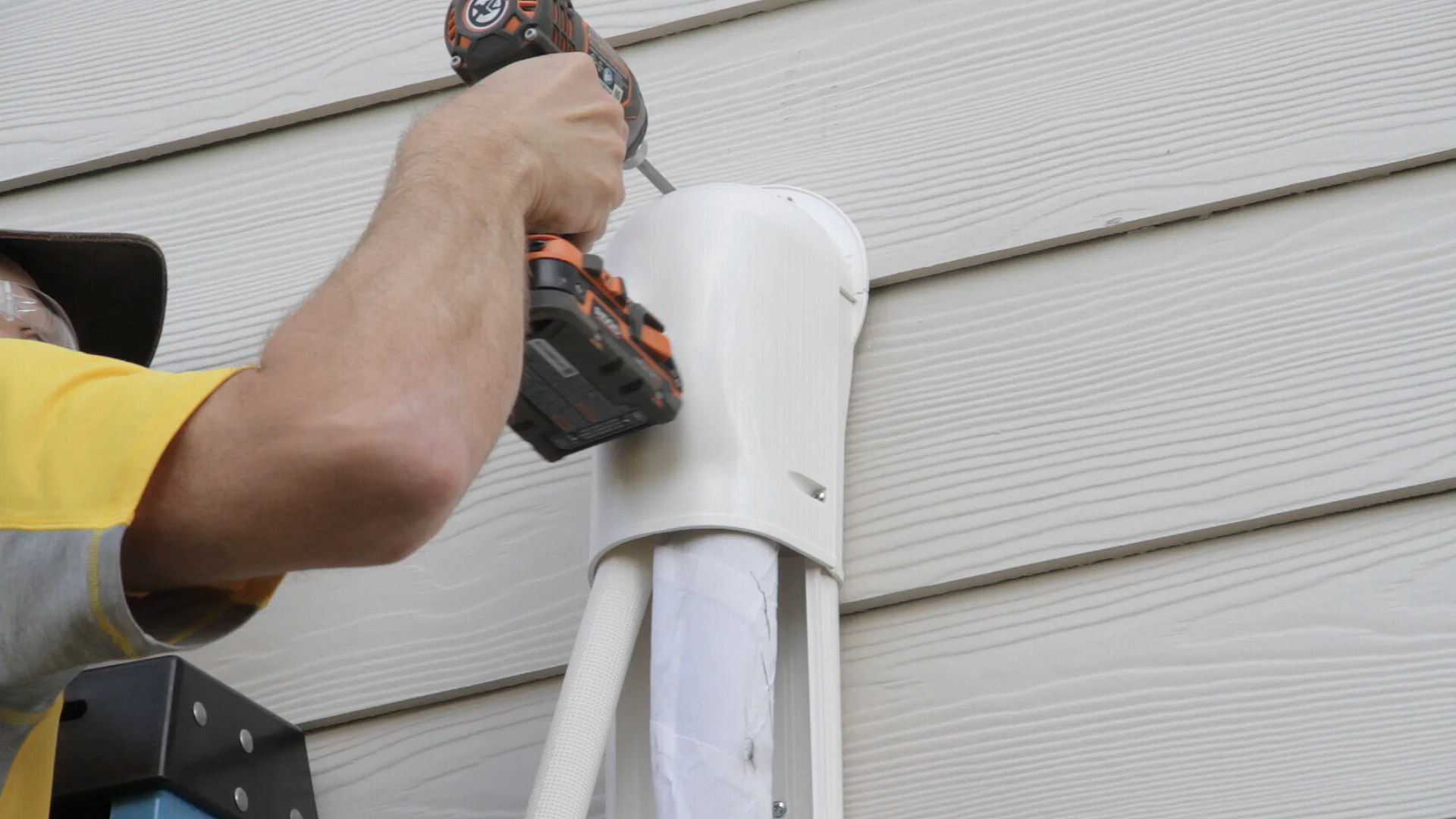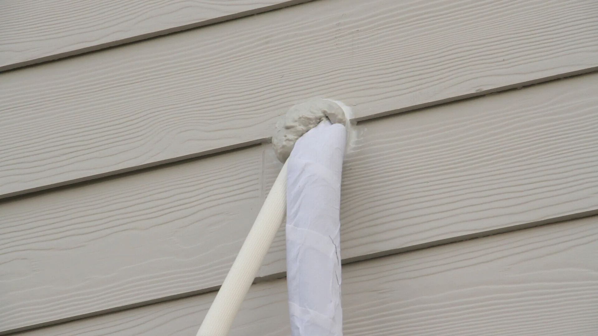 Back outside I used some caulk around the pipe and then some of the included neoprene inside it followed by low-pressure foaming sealant. I then attached the drain hose extension and began work on the line set cover.