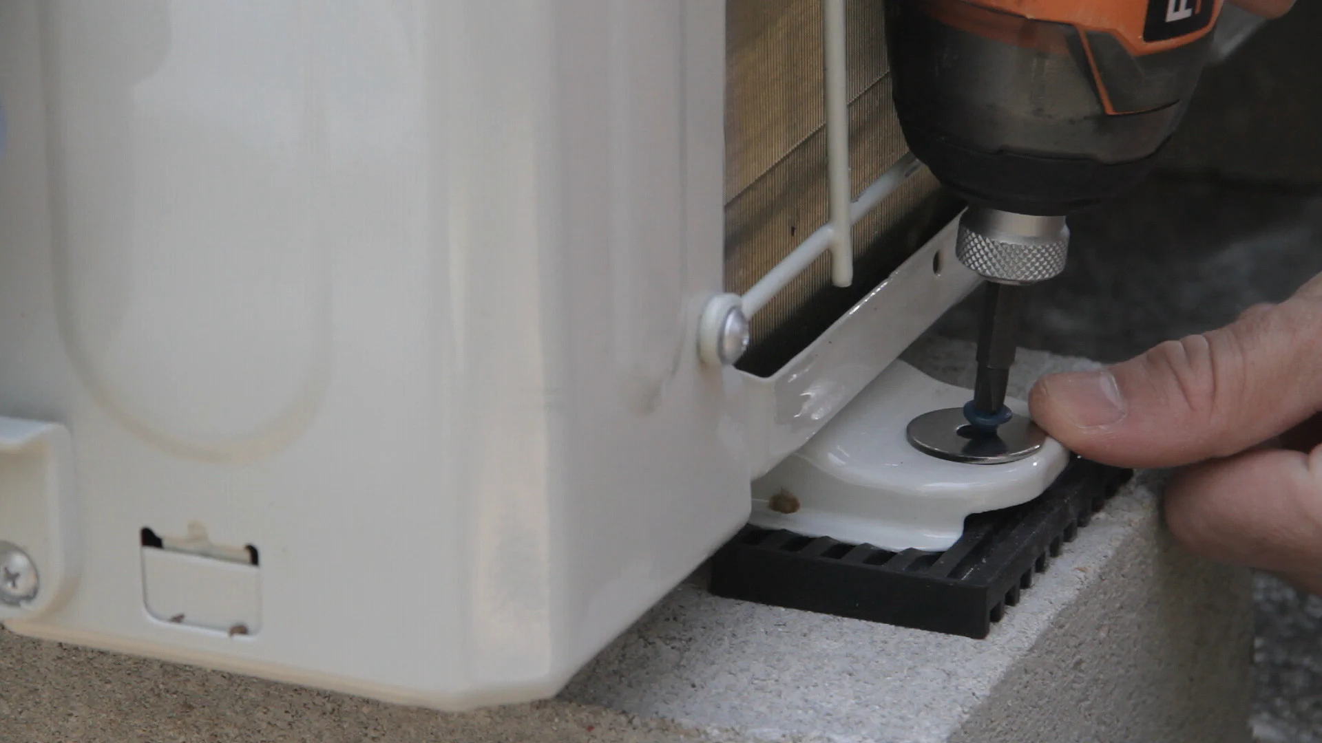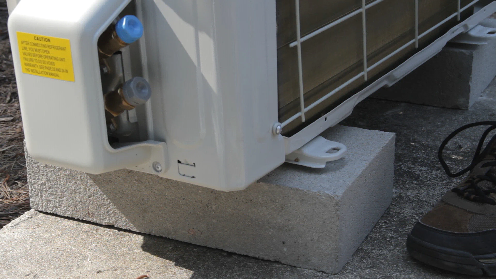 Next, it was time to set up the outdoor condenser unit. We decided to install it on a concrete pad on top of two concrete blocks just to raise it off the ground a bit in case of the occasional snow storm, but a condenser pad would work as well. I then inserted the rubber pads and mounted it to the concrete blocks with a few Tapcon screws.