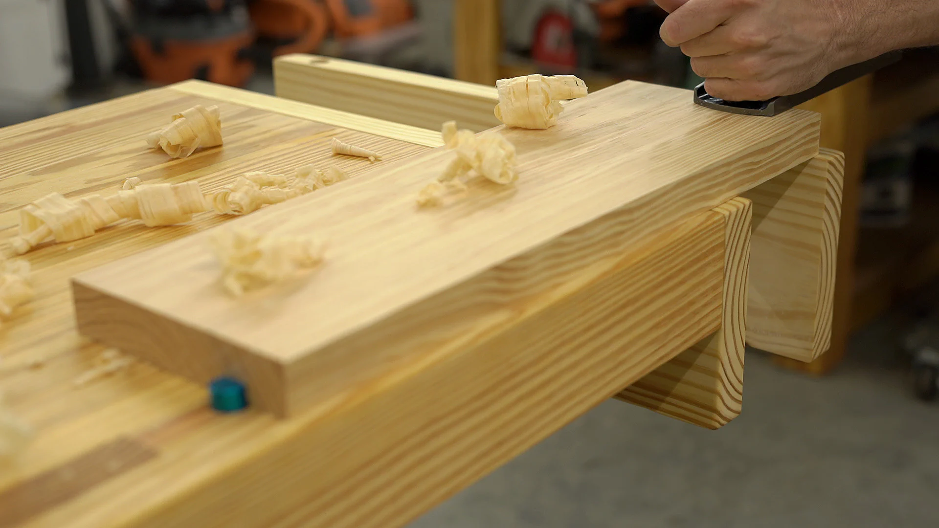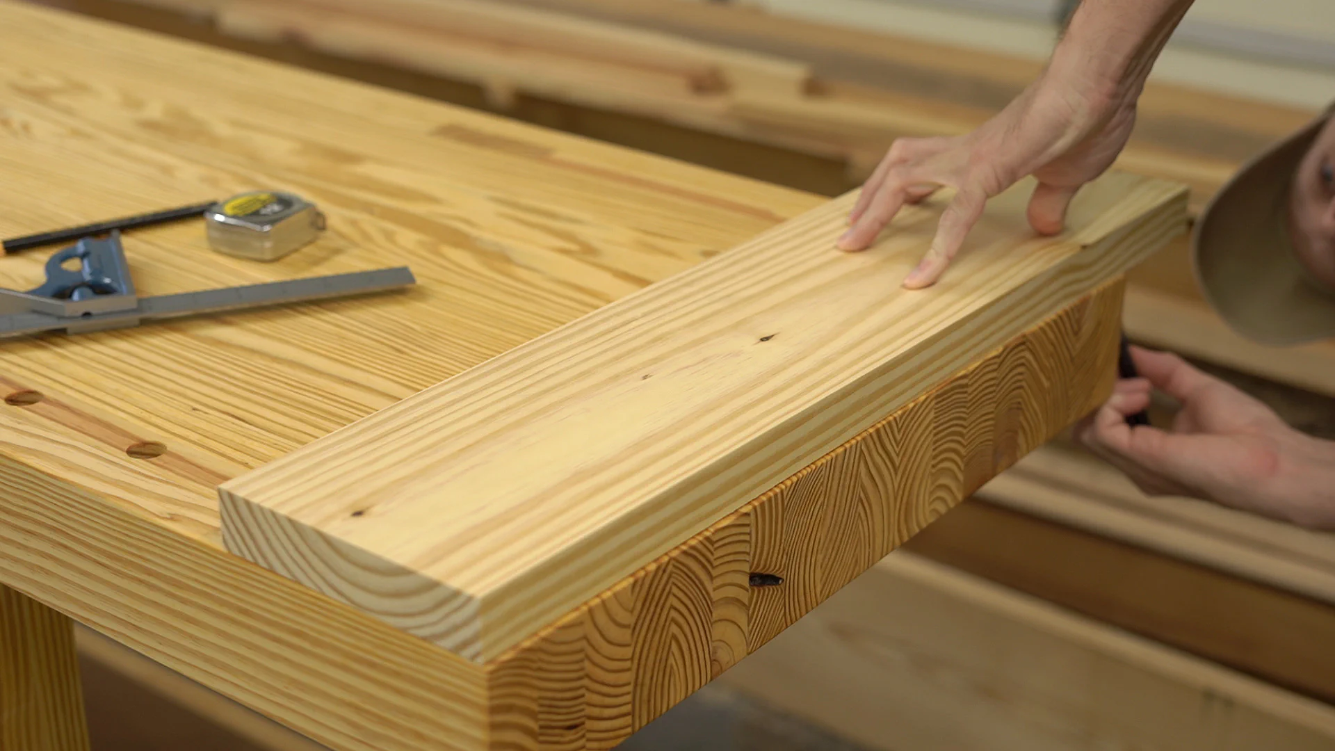 For my jaws, I used a 2x8 southern yellow pine board and marked off two knot-free sections that were roughly 6" longer than the width of my bench to account for planer snipe.