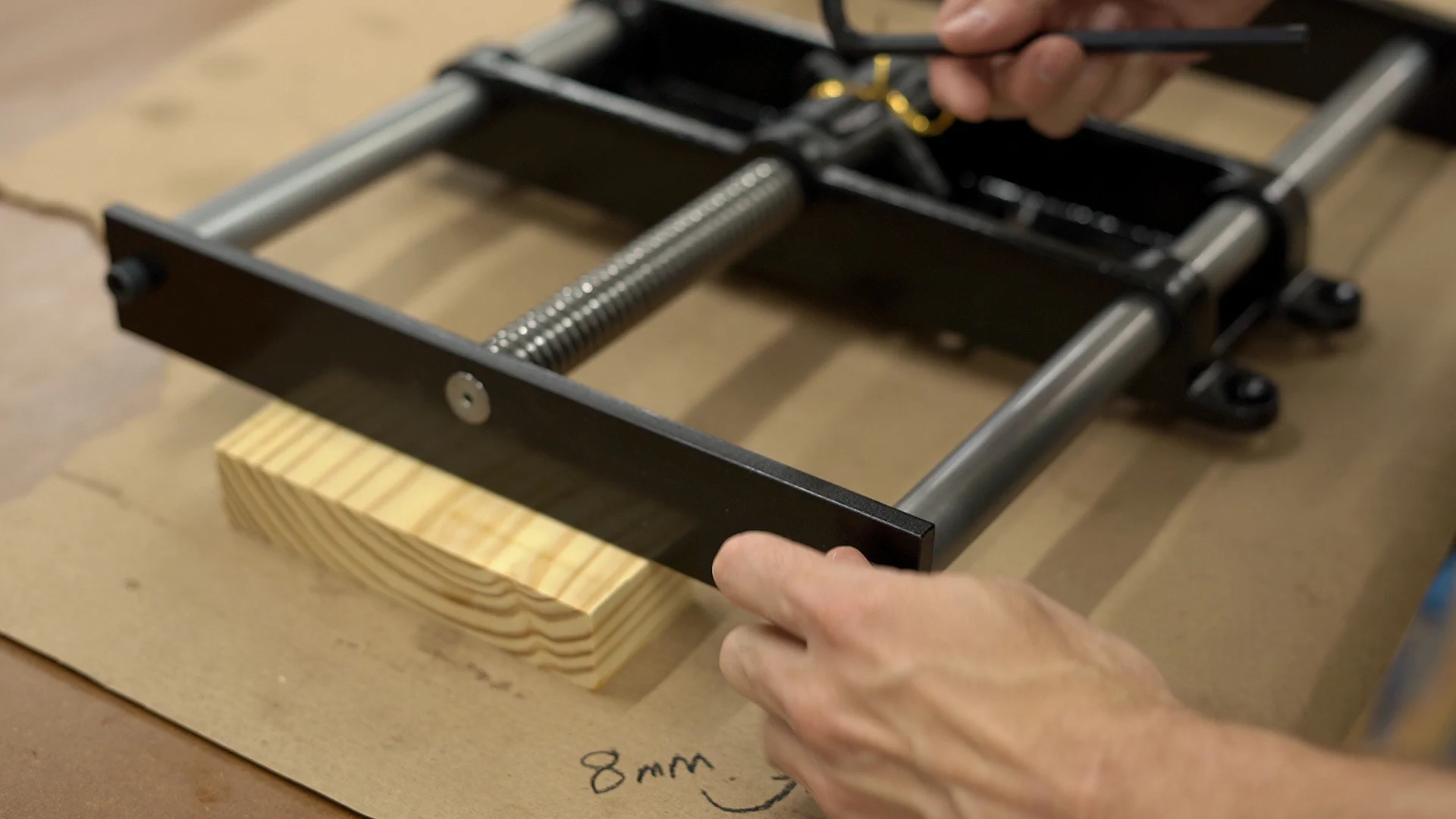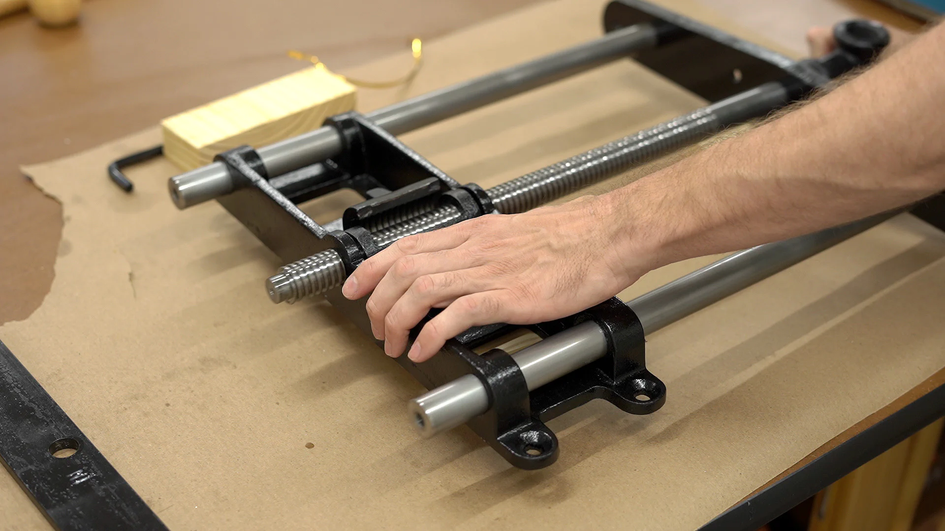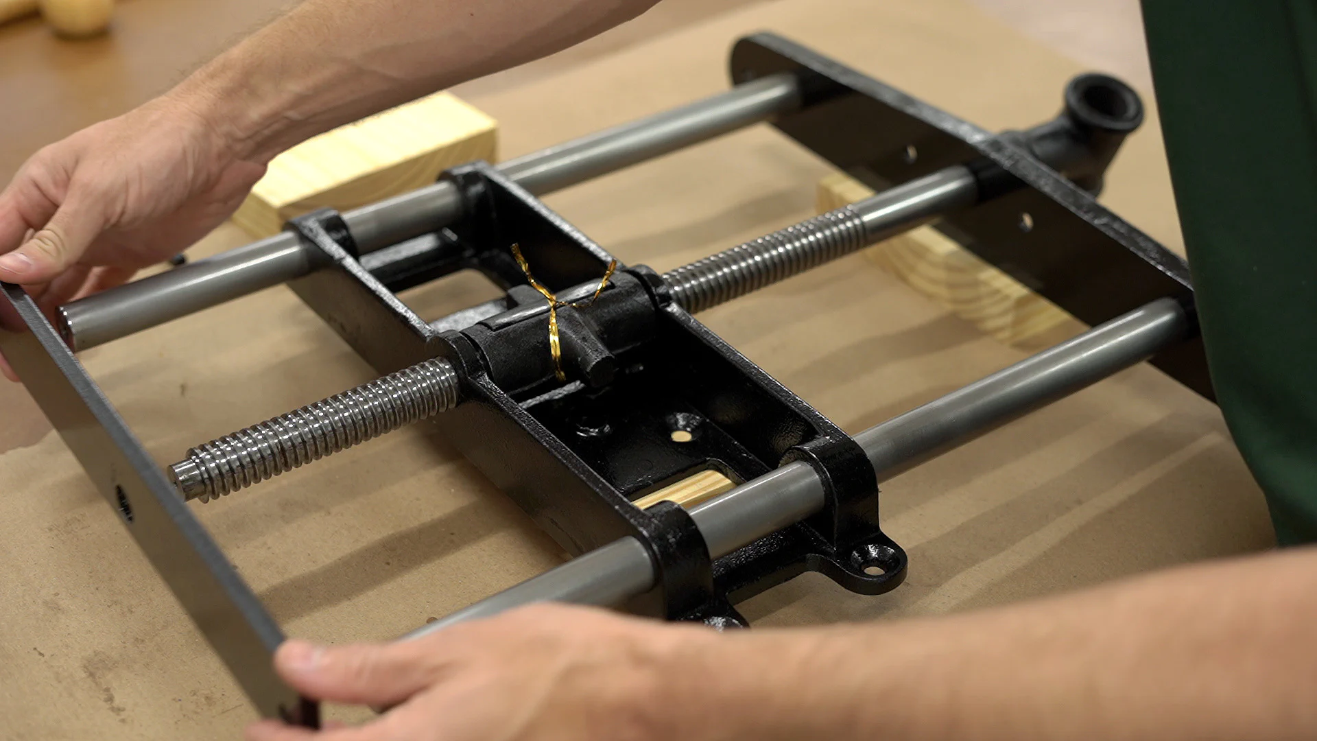 After inserting the outer wooden jaw onto the screw and rods, I carefully inserted them into the vise while holding the quick-release mechanism in place.
