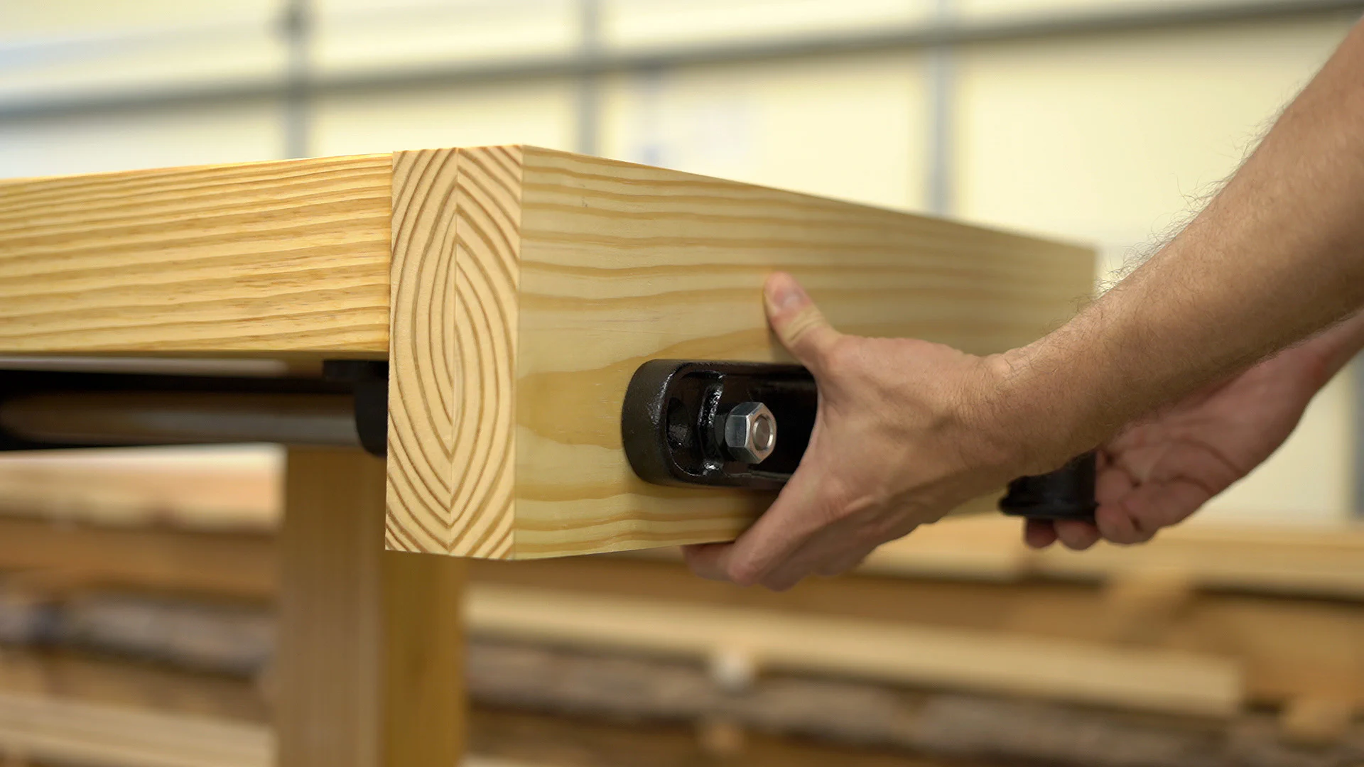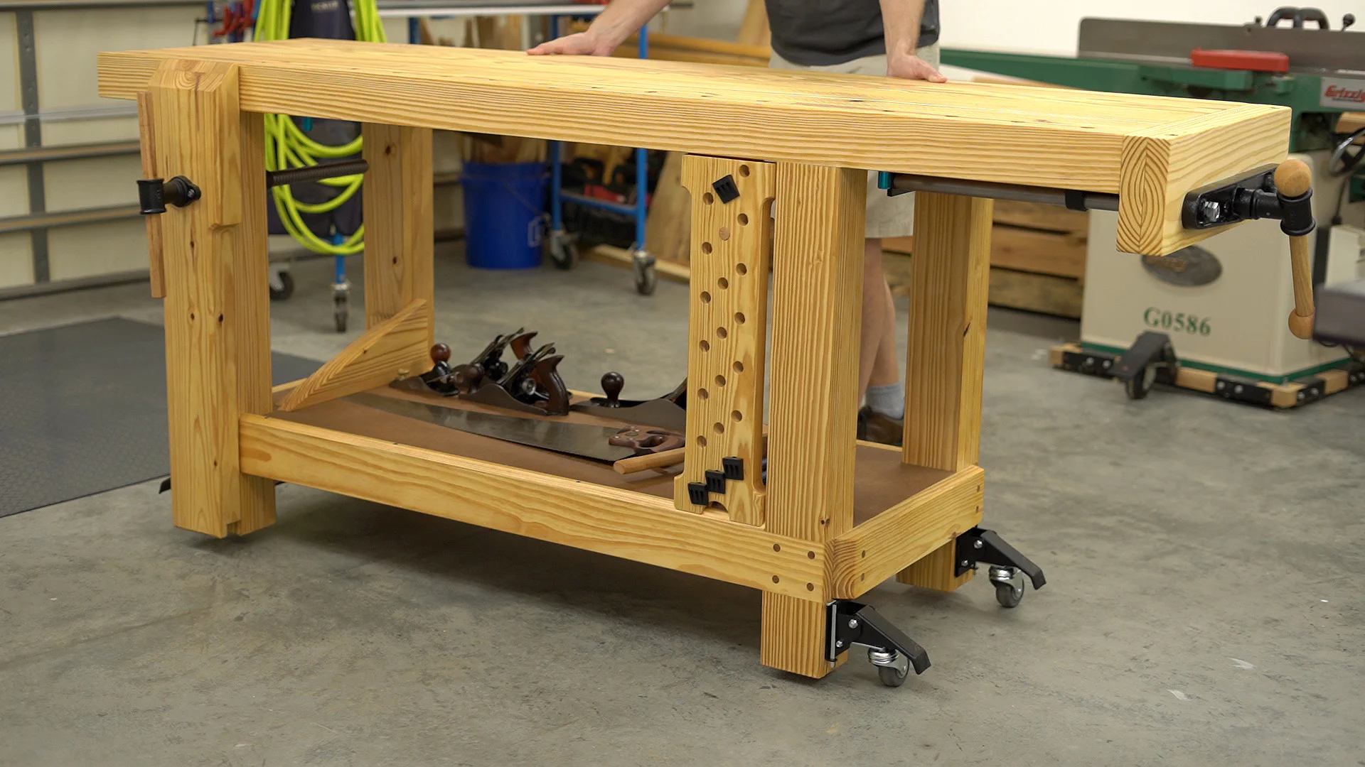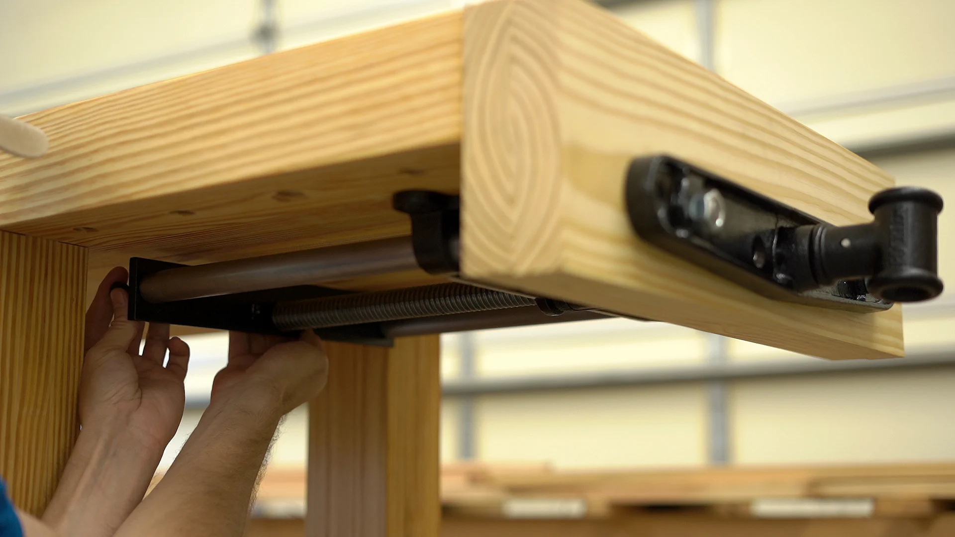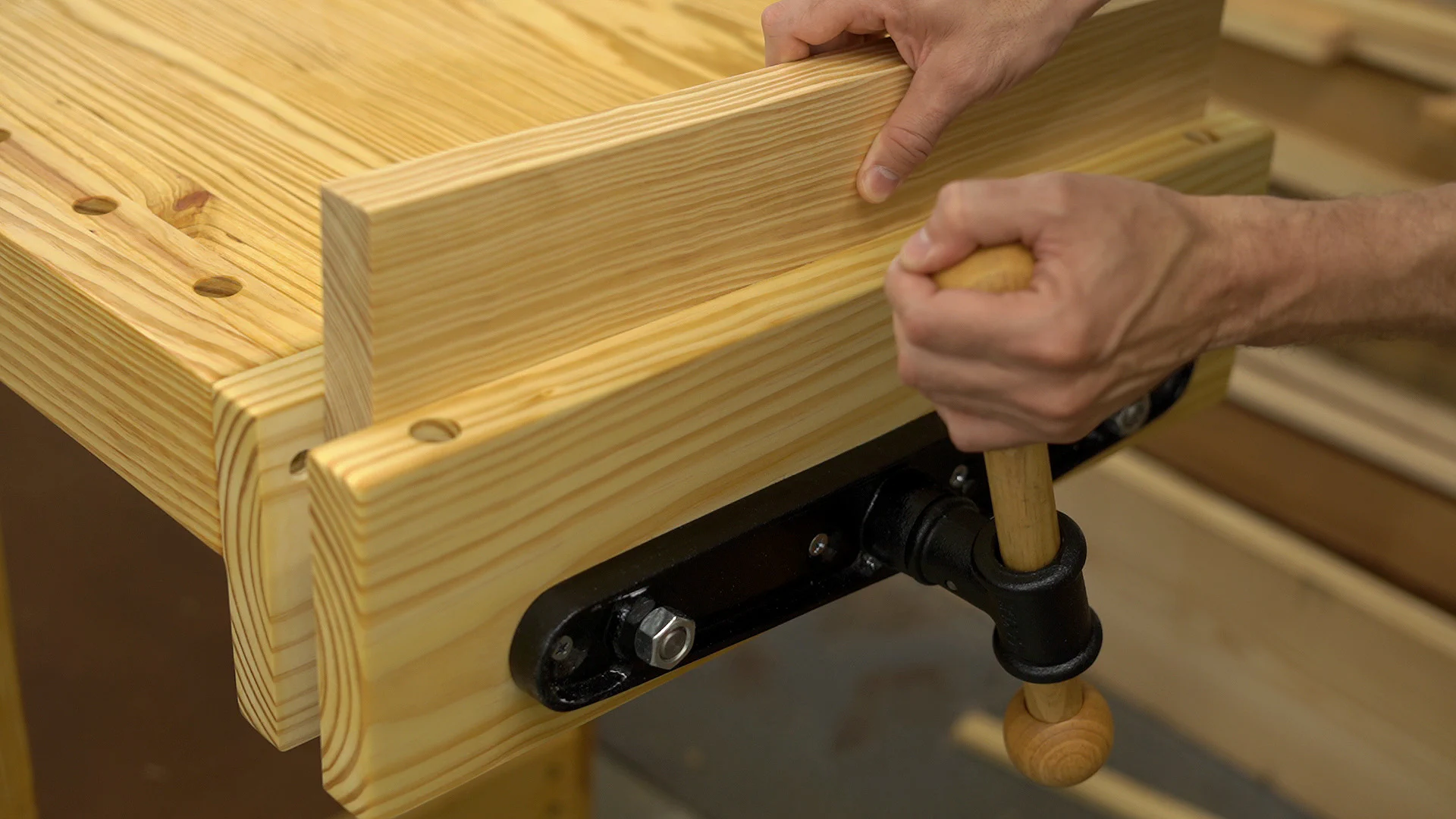 This vise comes with a nice wooden handle, but a pair of wooden jaws need to be built to match the workbench’s width and extend down about 3" below the bottom of the workbench’s top.